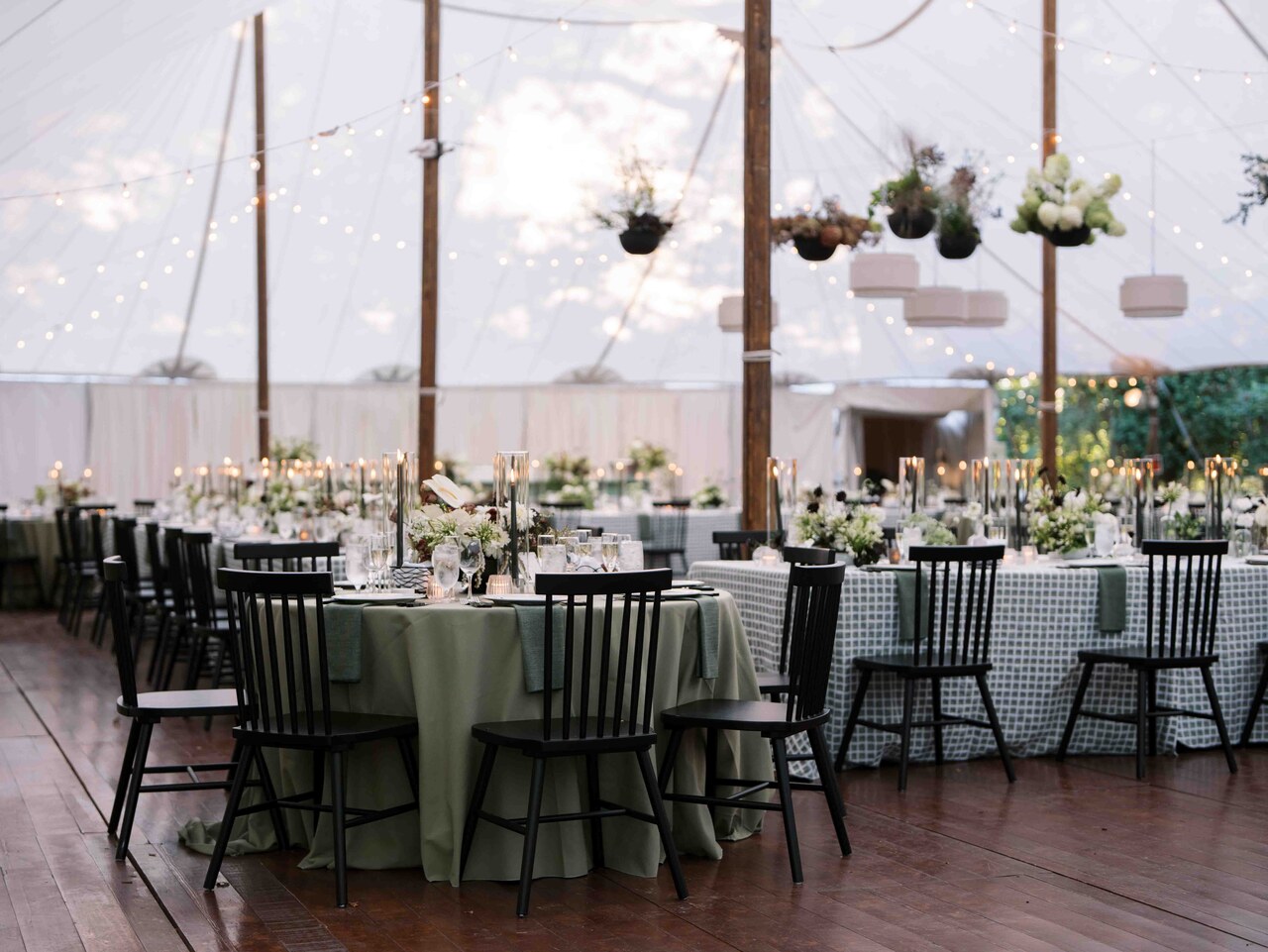 - Hudson Chairs + Linen-Draped Tables: A refined balance of modern and timeless