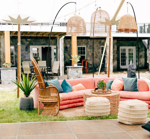 There were multiple lounges to choose from to kick back and relax like this jewel toned soft seating group highlighted by the Freestanding Pendant Holders with the Seagrass Chandeliers over the green velvet Dexter Chairs, Wicker Peacock Chairs, leather poufs and Seagrass Coffee Table!
