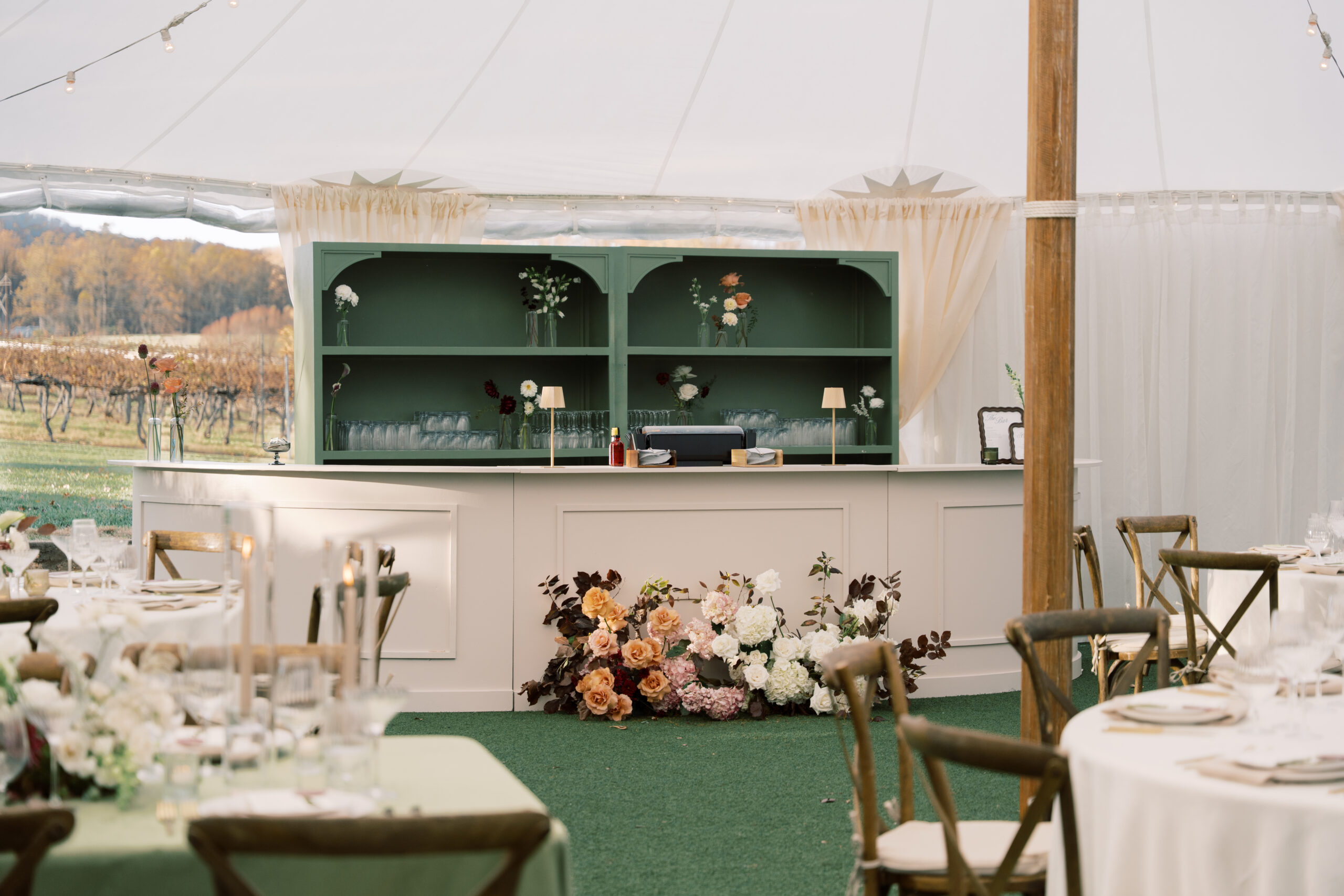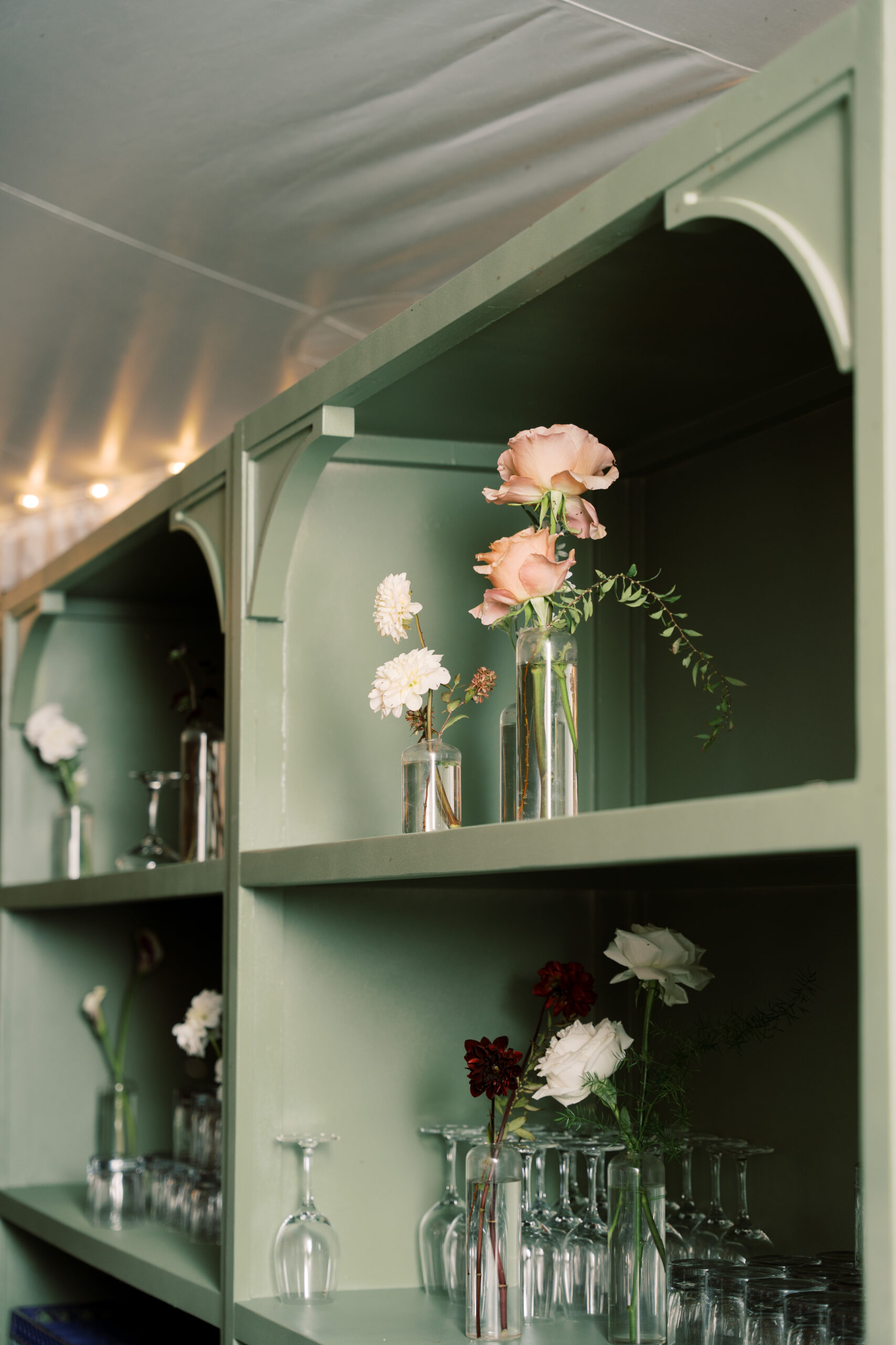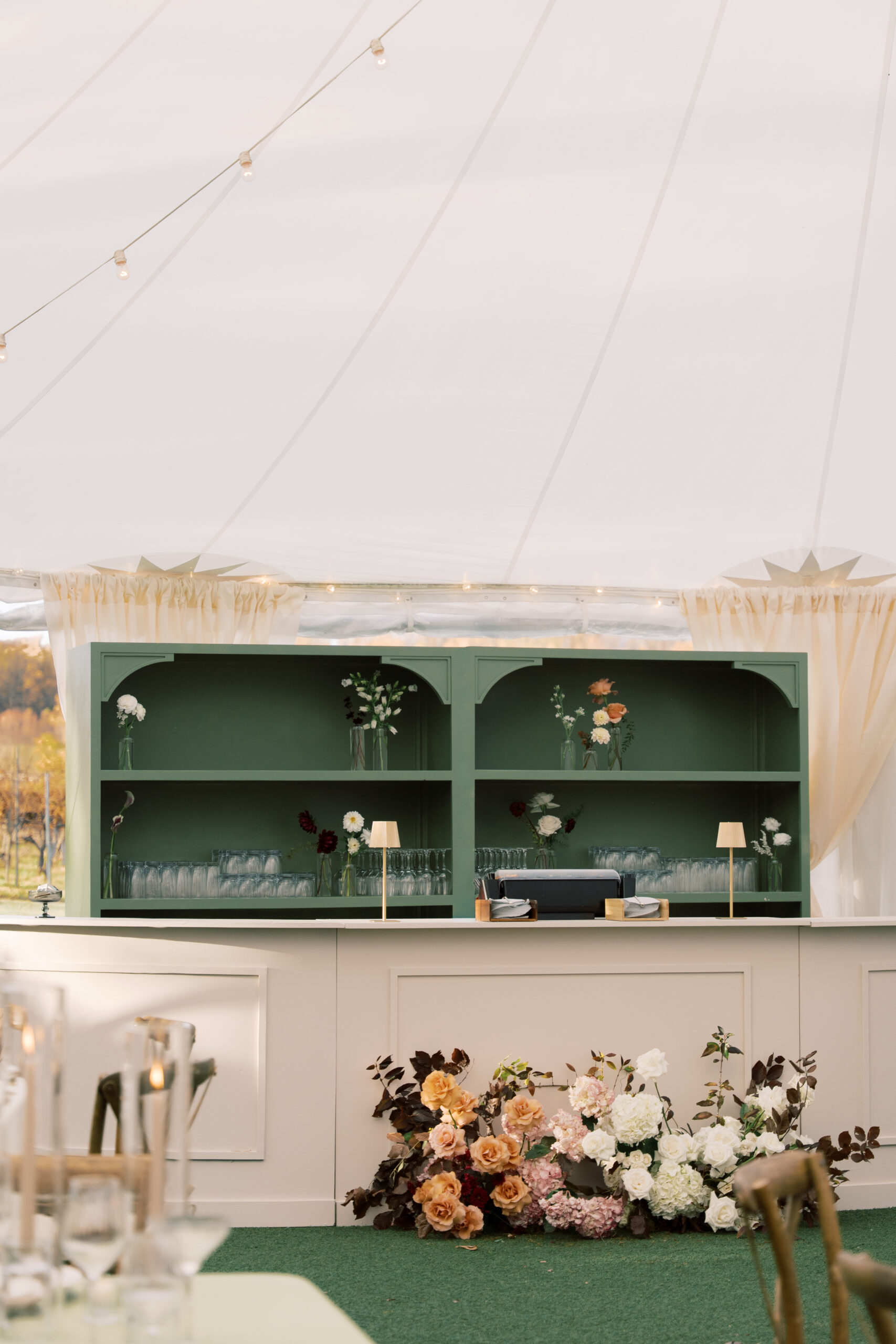 Behind the bar, the Customizable Statement Shelving painted in a gorgeous deep green hue added dimension and visual interest. Styled with glassware and décor, the shelving created a layered backdrop that complemented the surrounding design while providing a functional service area for the evening.