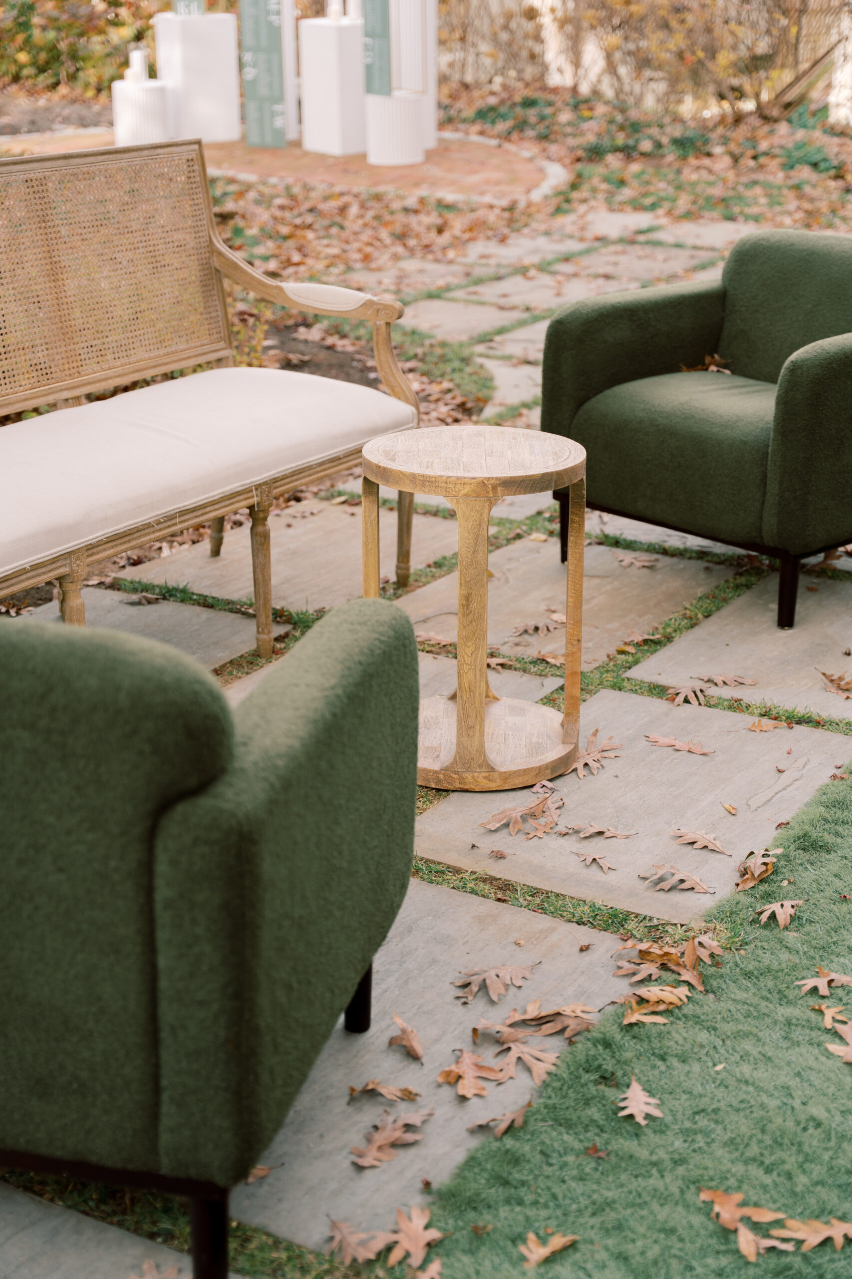 At the dining tables, the Willamette Chairs brought warmth and elegance to the overall tablescape. Nearby lounge spaces featured a curated mix of the Camilla Sofa, Linden Cane Back Sofa, and Stanley Chairs, paired with a Natural Round Wooden End Table to create inviting conversation areas throughout the tent.