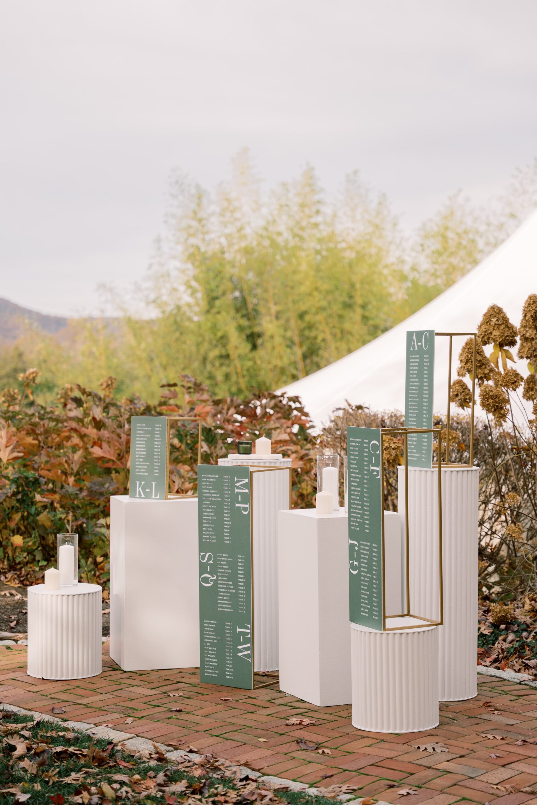 Architectural accents helped guide the design and highlight key areas of the celebration. White Wilhelm Pedestals in both 16″ and 32″ heights framed floral arrangements and signage, adding height and visual structure throughout the space.