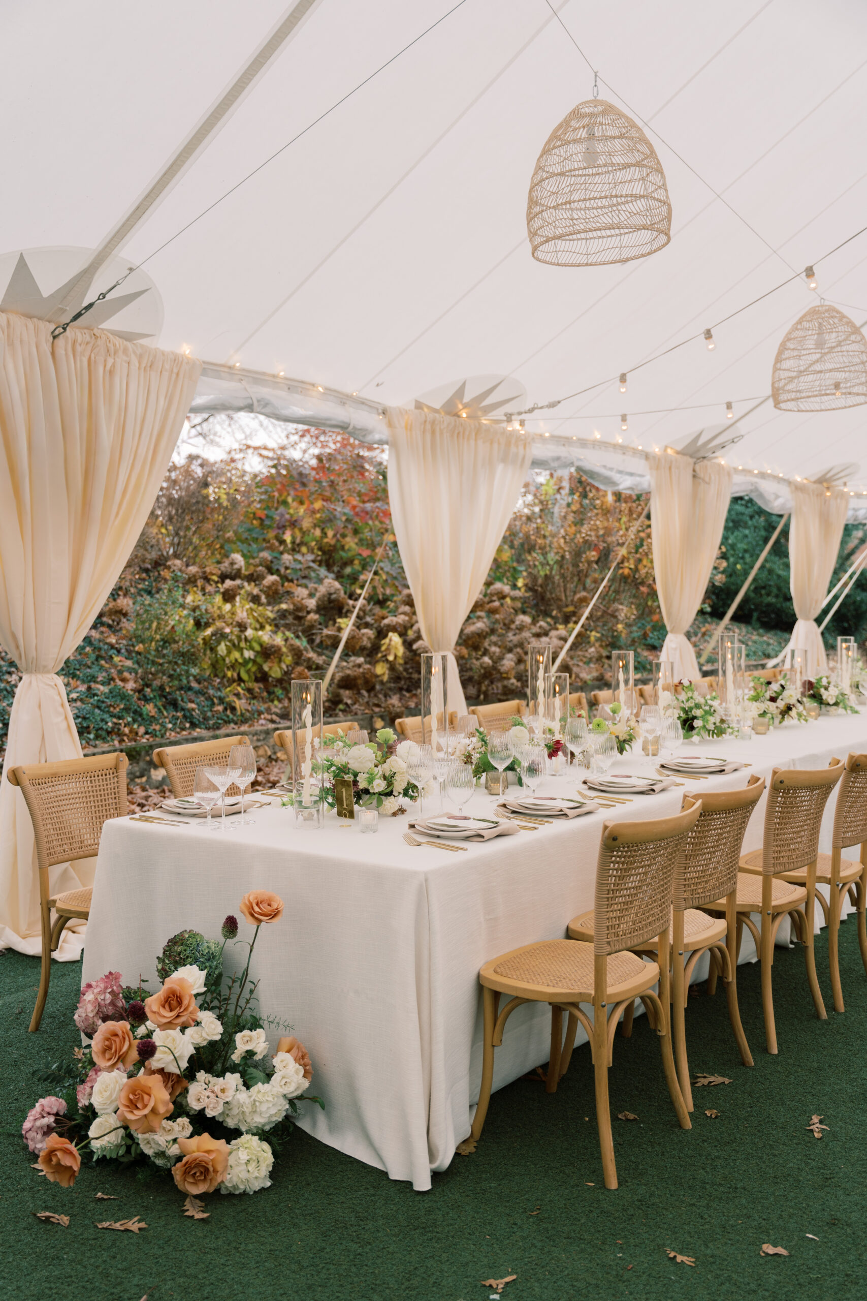 Mallory and Jake’s November wedding embraced a palette of soft neutrals and rich greens, creating a celebration that felt both refined and inviting. Beneath a glowing tent filled with warm light and layered textures, thoughtful design choices transformed the space into an atmosphere that was elegant without ever feeling overdone.