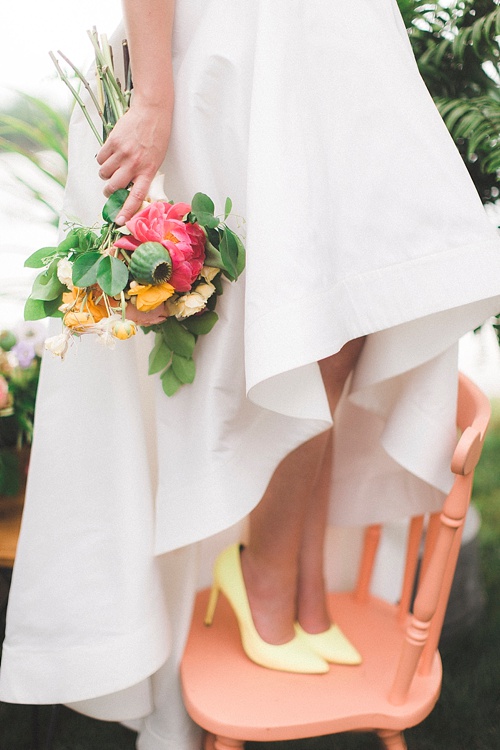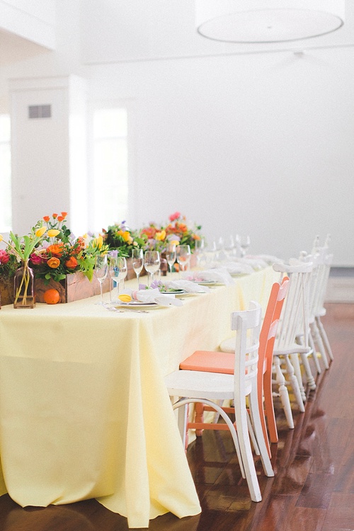 When we work with our fantastic photographer friend Stephanie Yonce we can always count on one thing, it’s going to be a day full of high fives, hugs and rainbow hues! This styled shoot at the gorgeous new Virginia venue, Upper Shirley Vineyards, proved to be all that and so much more! Recently featured on Burnett’s Boards this shoot was inspired by a bright palette of citrus shades. The final product shows just how talented the gals at LK Events and Design are as they did an absolutely wonderful job at pulling this pretty plan together! From colored glass bottles to wooden ceremony benches this wedding inspiration is as gorgeous as it is attainable! Enjoy all the darling details below!