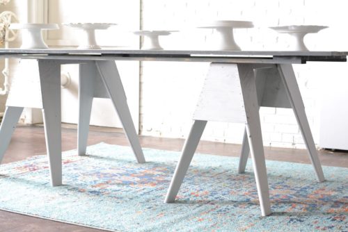 In this week’s Inspiration Station, we wanted to show off our gray sawhorse farm table! We took what’s considered to be a “rustic” piece and spun it into a fresh monochromatic modern accessory table! The gray sawhorse farm table can be used as a buffet table (much more cost effective than renting traditional farm tables), a favors display, dessert buffet, even an oyster shucking station, and more!