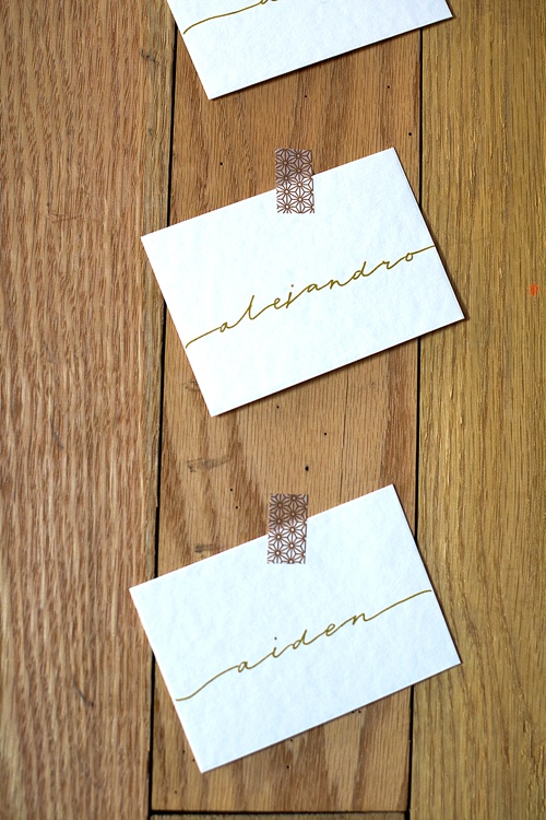 A roll of pretty patterned washi tape and some hand-lettered name cards and you’ve got yourself the makings of a seating chart!