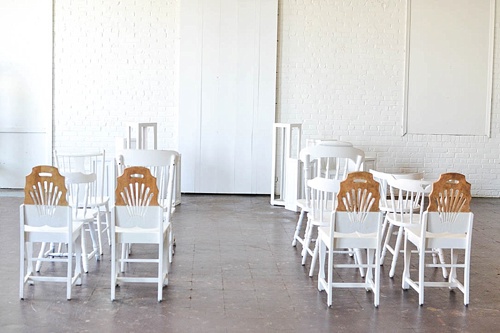 Our Mismatched White Chairs offered the perfect option for ceremony seating in this bright design! To add a little touch of whimsy we chose our custom designed White & Wood Blocked Chairs to fill out the back row. Such a surprising and fitting addition!