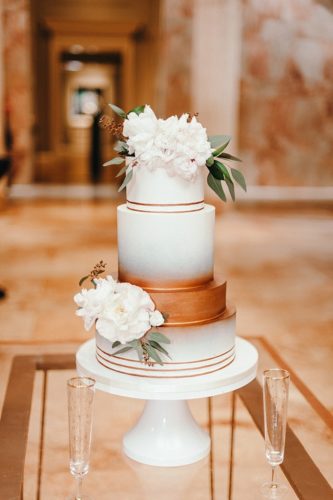 We’re really loving our swanky Hairpin Plexiglass Table as a cake display piece! It’s clean lines and copper accents work wonderfully in this event design. And how about the copper accented cake from Sweet Fix? Swoon.