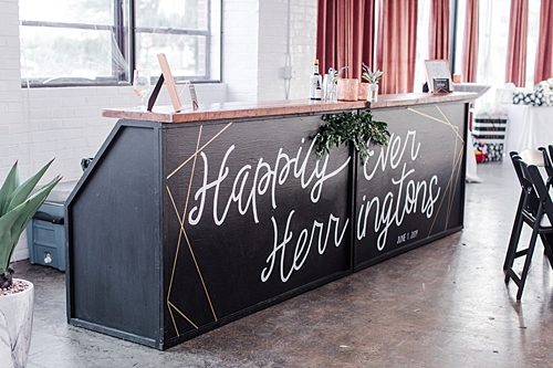 Custom lettering on our Homestead Chalkboard Bars never gets old, and we love this modern design from a wedding at Studio Two Three with The Hive Wedding Collective. This extra-long bar was created by placing two bars side-by-side and designing the lettering to run across both of them! Photo by Bri & Wes Photography.