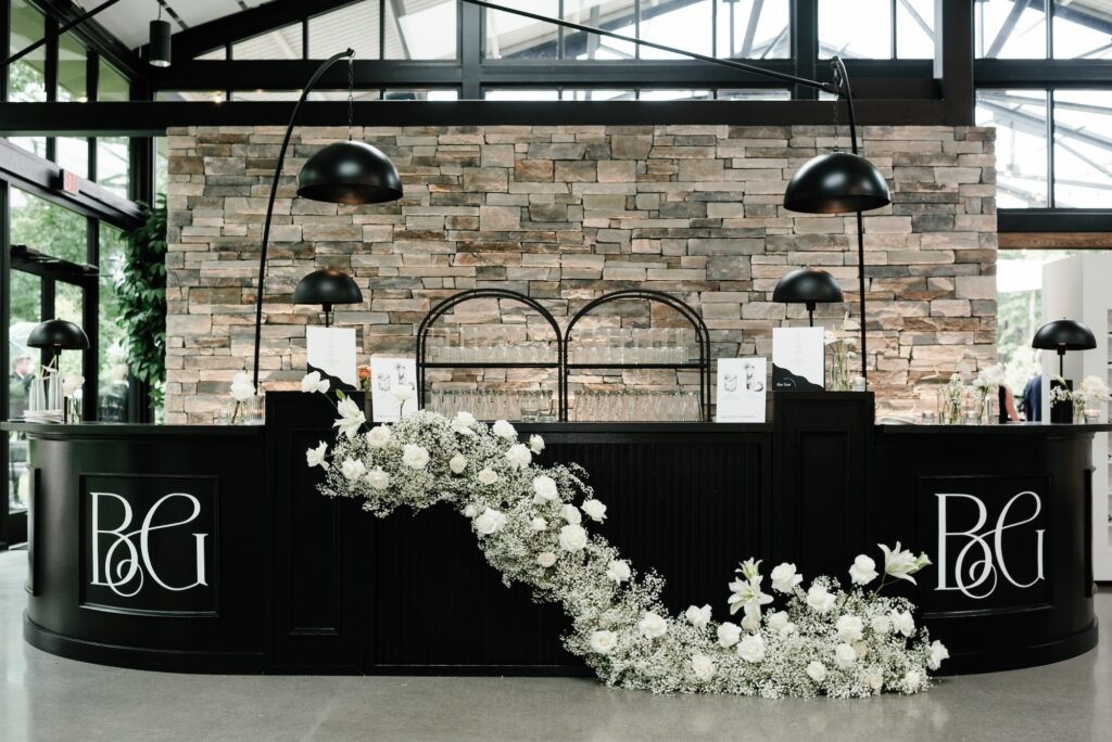 If you are having custom stationery created for your wedding or event, a custom bar can be an idyllic way to display that artistry. The white monogram on our custom-painted black bar really makes a statement.