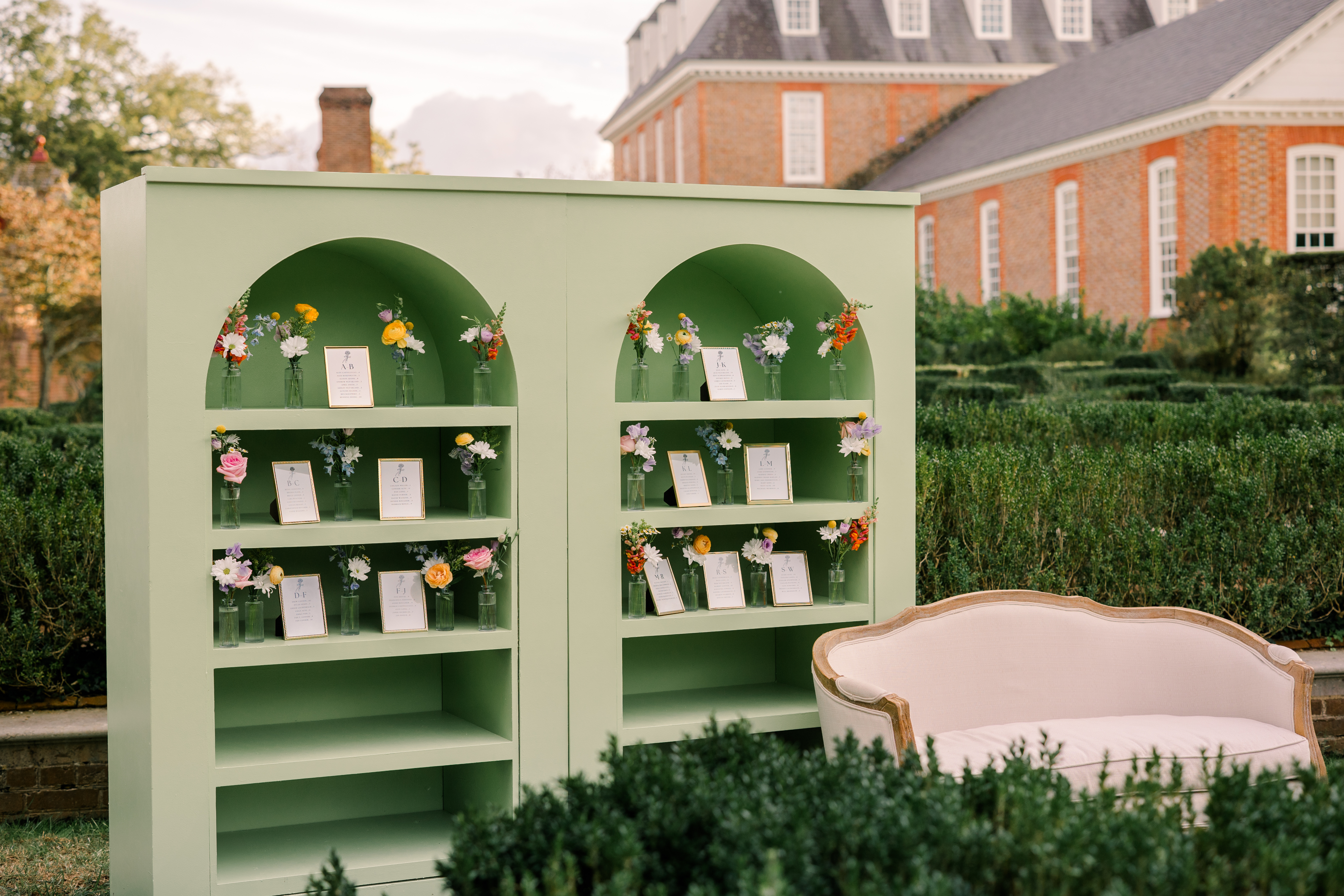 The possibilities are endless with our arched display wall! Perfect for champagne displays, escort cards, or favors! Event photos by Christy Nicole Photography, Justin Hankins Photography