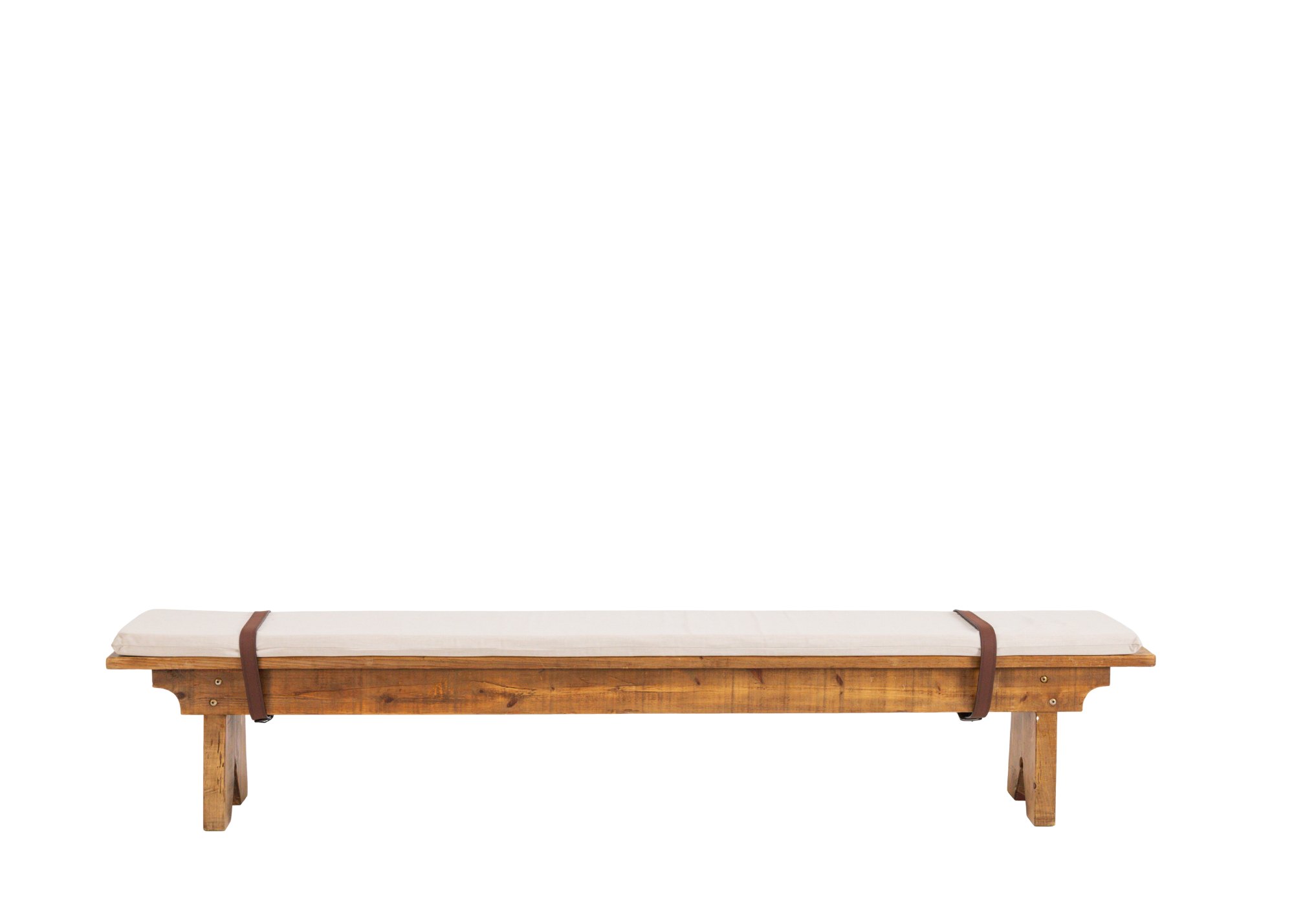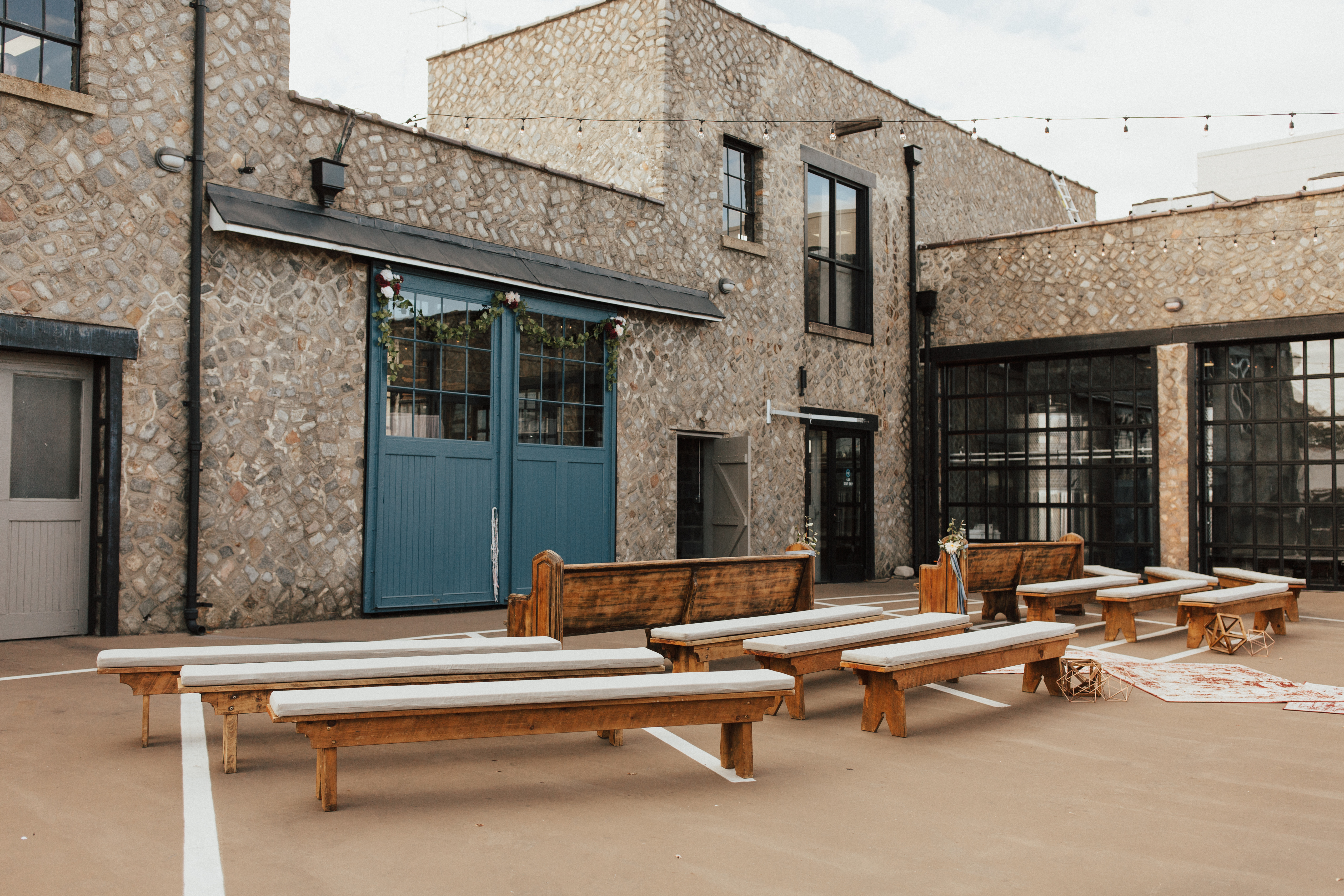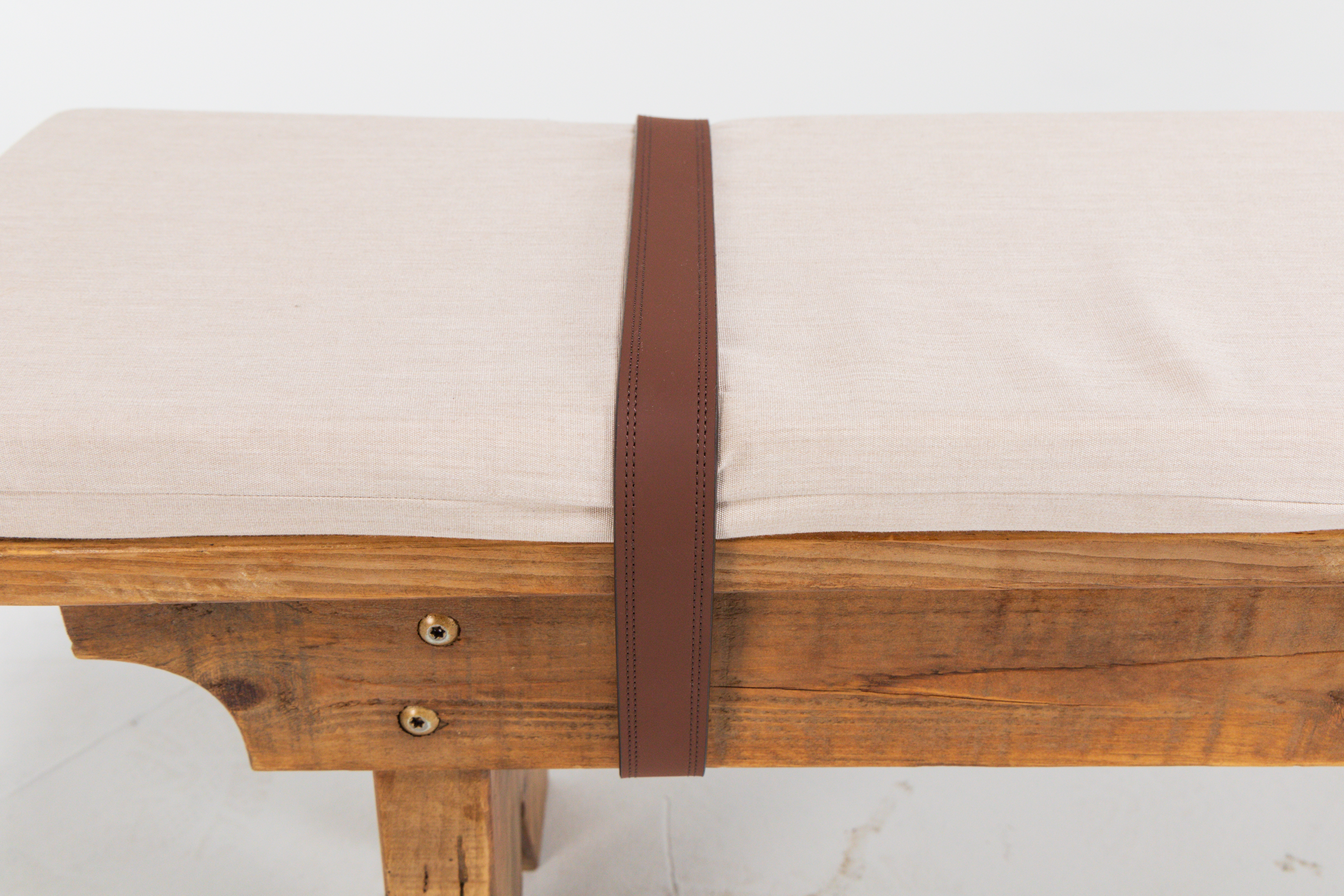 Beautiful solid pine bench stained in a dark brown hue paired with our Gray Cushions that are held in place with a brown leather strap, ensuring comfortablity without any sliding! These beauties are each 8 feet long and seat up to 5 for a ceremony and 4 when paired with a table for dining. Event images by Peyton Curry and Samantha Leto Photography.
