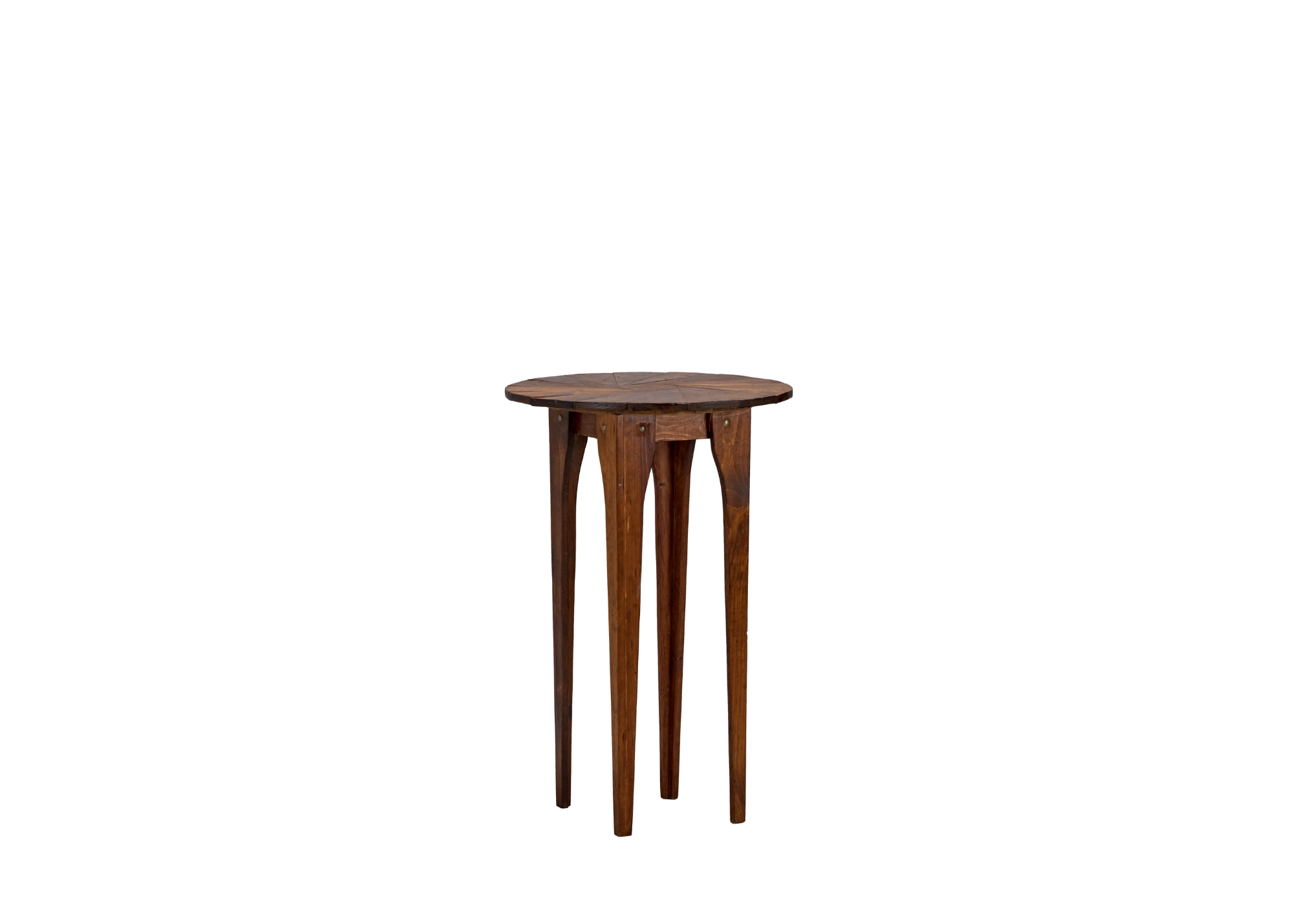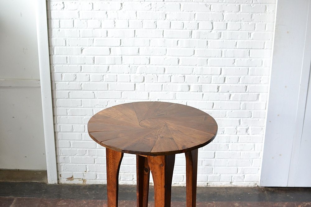 Custom designed and built in our shop! These cocktail tables are a gorgeous dark-stained wood. The tops feature a unique circular pattern inspired by a camera aperture.
