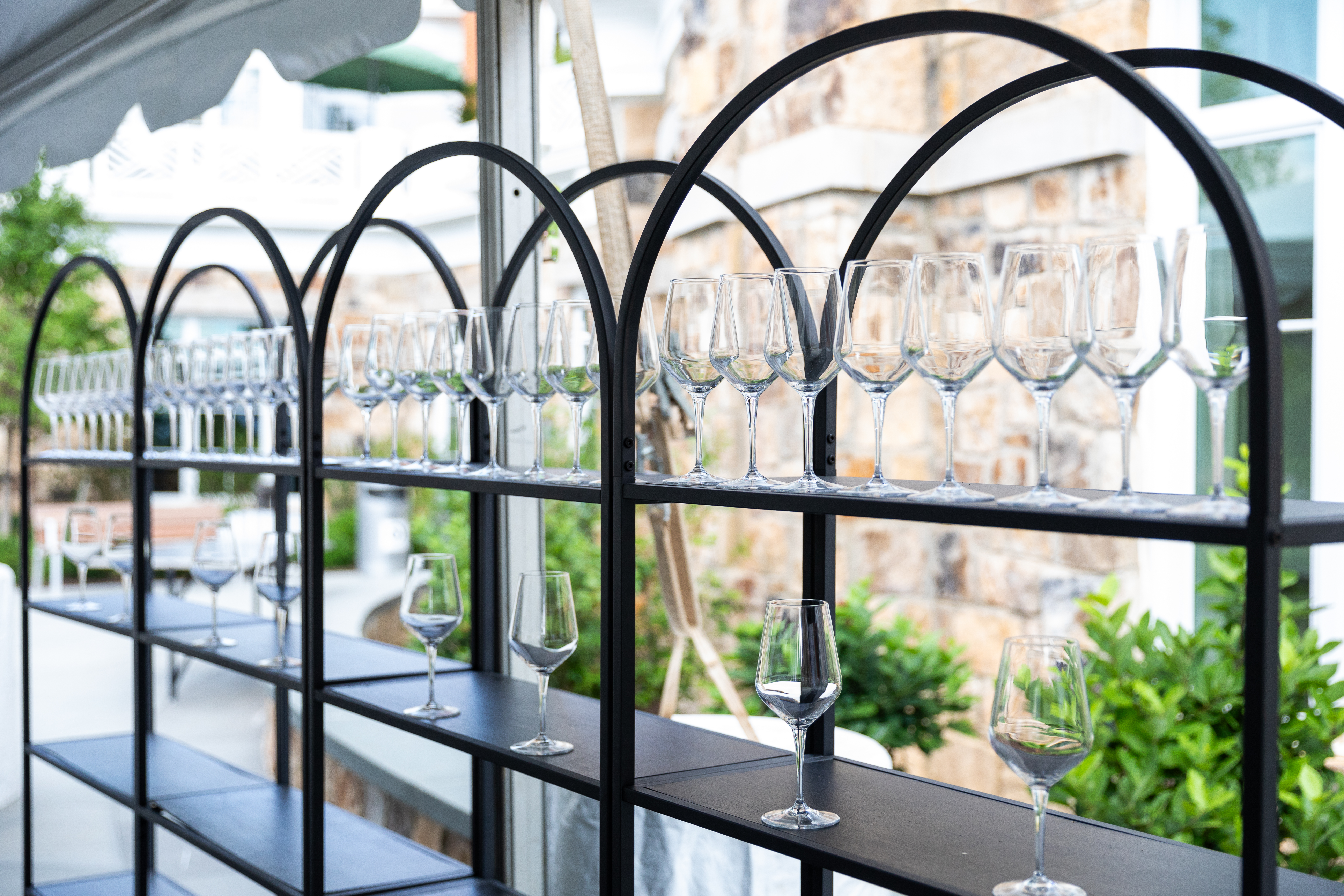This sleek arched black metal shelving is perfect for a drink display at cocktail hour or a display of wedding favors for your guests! Event image by Jannatul Pramanik Photography