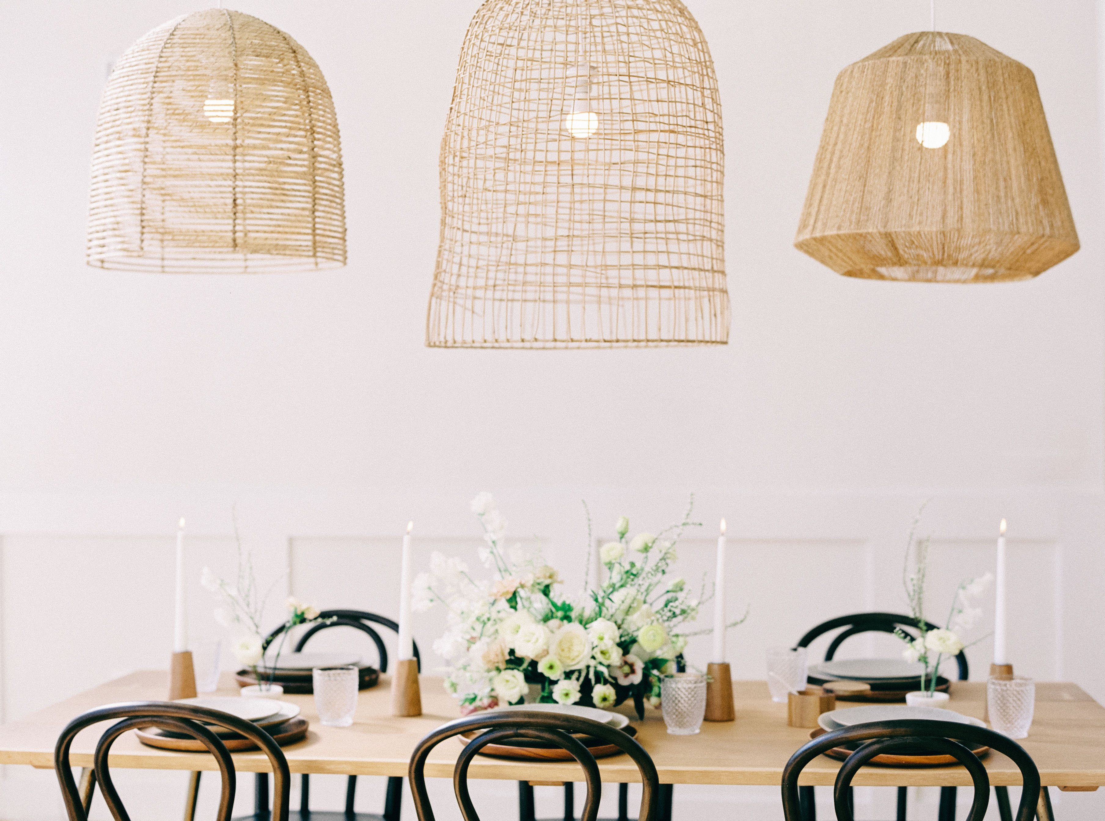 A lovely part of our rattan chandelier collection! A fun way to add that extra boho touch to any event! On-site installation available on P&J arbors, trusses and other rental items. Event Image by Nikki Santerre.