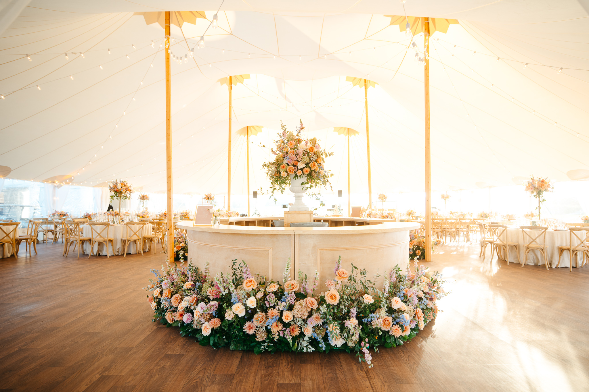 Stately light wood round front with crown molding detail and a light wood bar top. This unique rounded shape is a focal point for any event! Event image by Justin Kunimoto Photography, Ray Phtograophy and Jill Merriwether Photography.