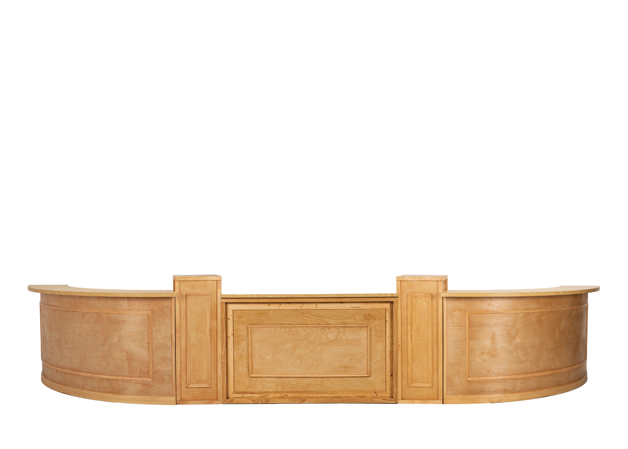 Stately light wood half oval bar with crown molding detail and a light wood bar top. This large unique shape is a focal point for any event! Event Images by Stephanie Whitehill Photography, Liz Andolina Photography and Allison Dash Photography.