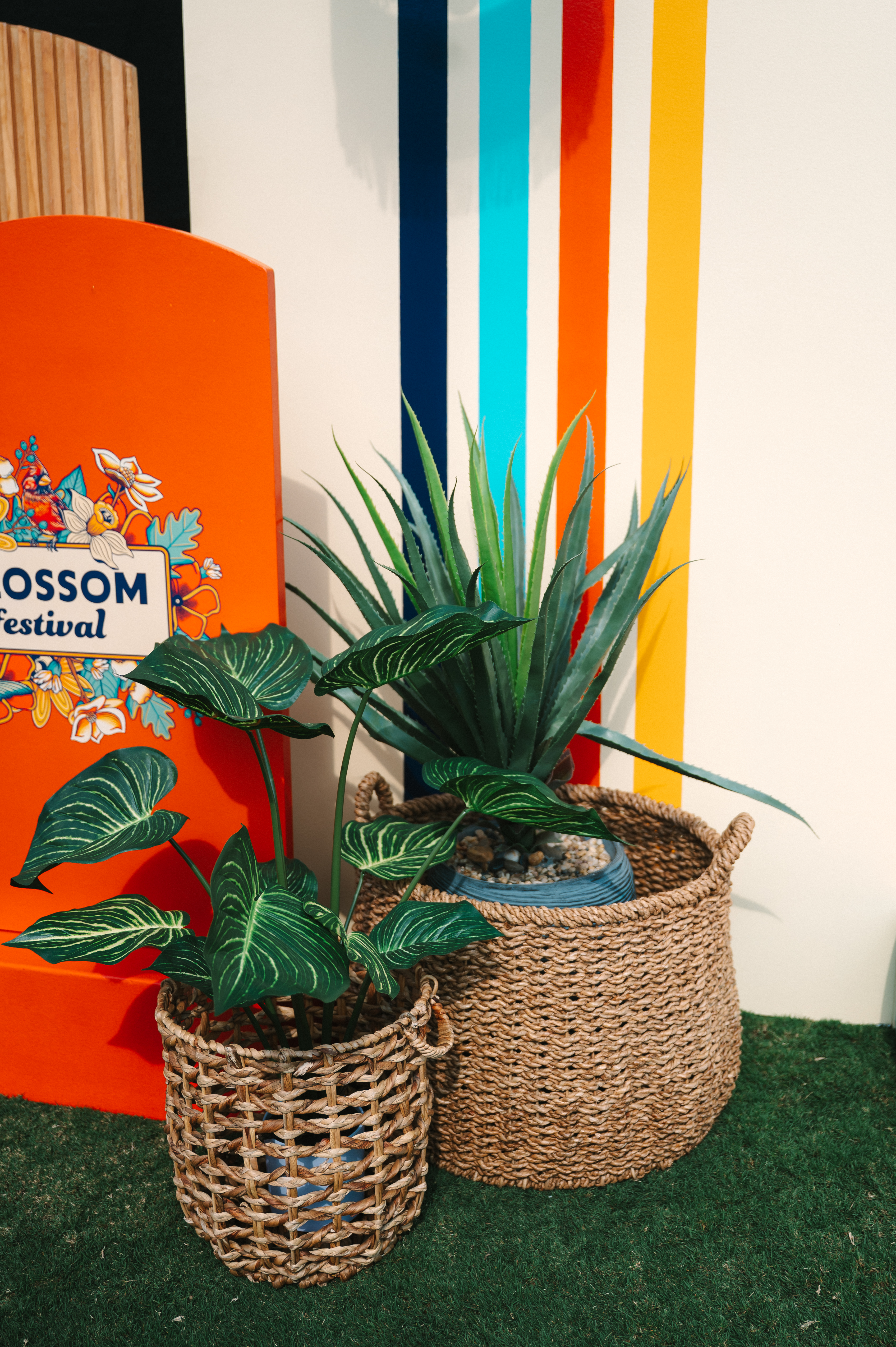 Modern and eclectic faux plants in white planters. These pieces are perfect for adding texture and color to a home staging design or event lounge area! Event Photo by Brand Gloss.
