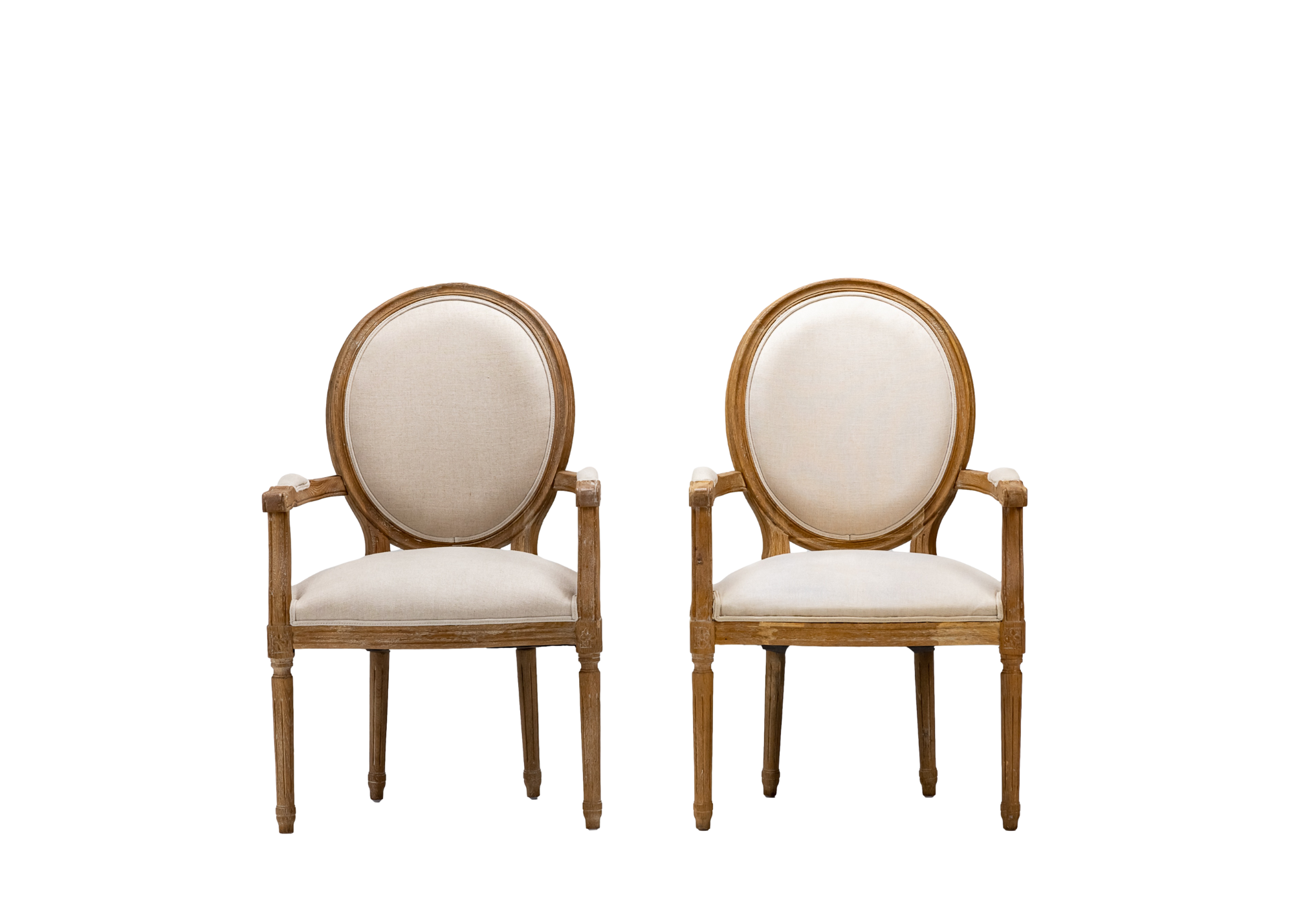 Neutral and refined - these chairs feature linen upholstery with wooden accents. They are sure to add romantic flair to any lounge area!