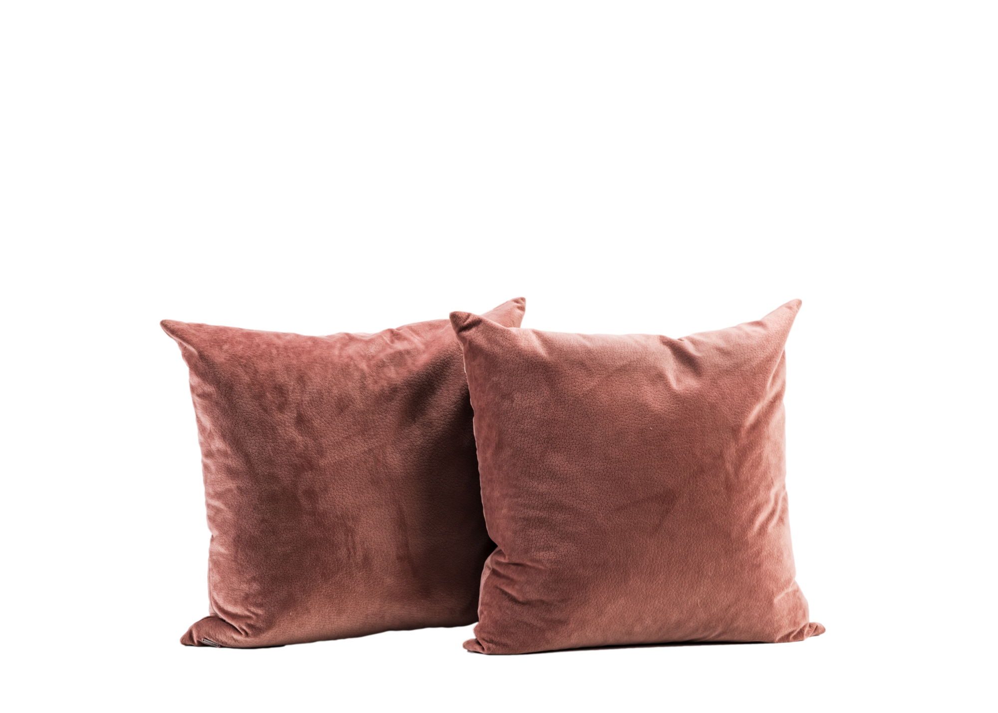 A pair of classic square pillows covered in a luxurious mauve colored velvet pattern that also boasts a unique and understated texture. Perfect for lounge areas or boudoir shoots!