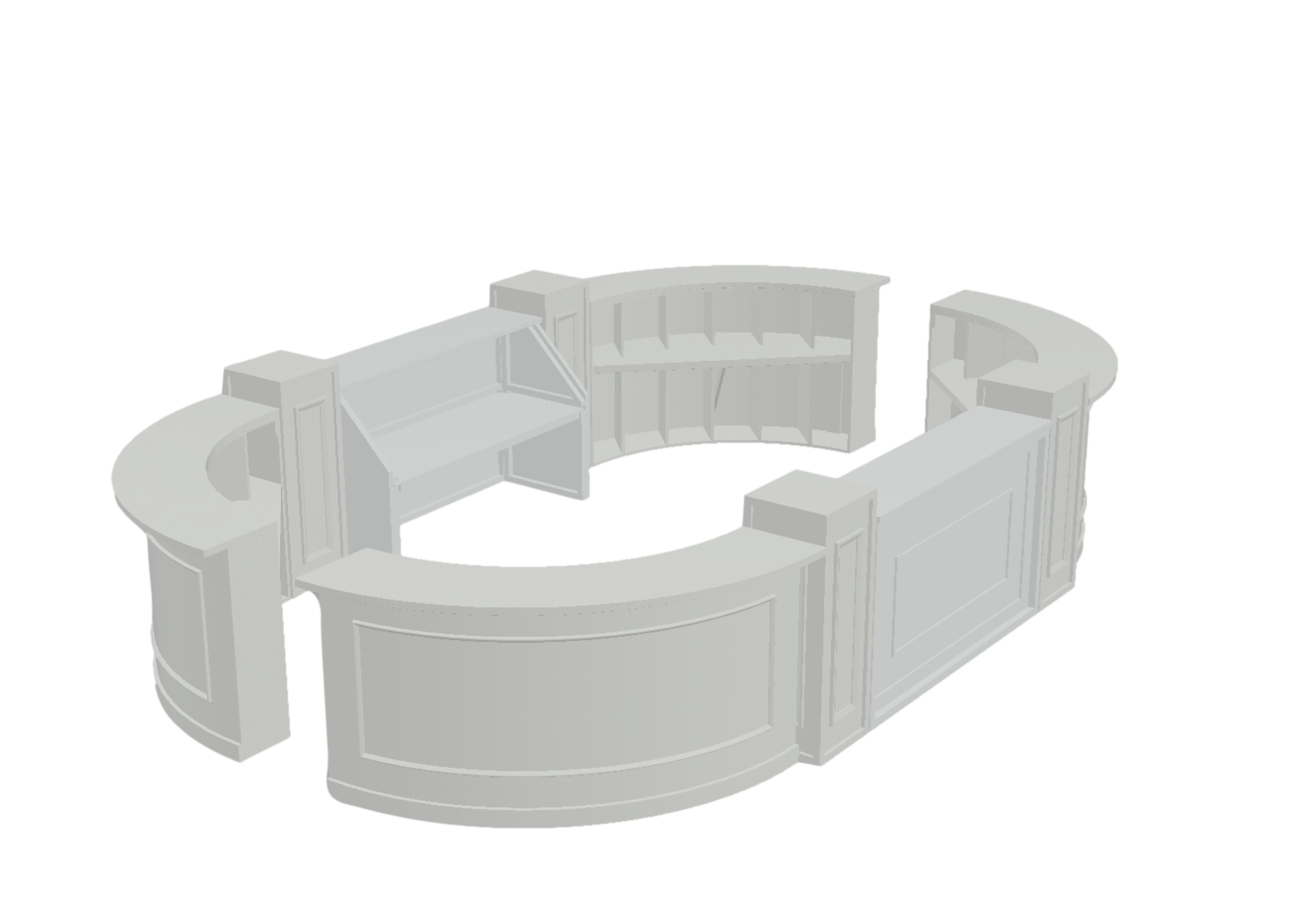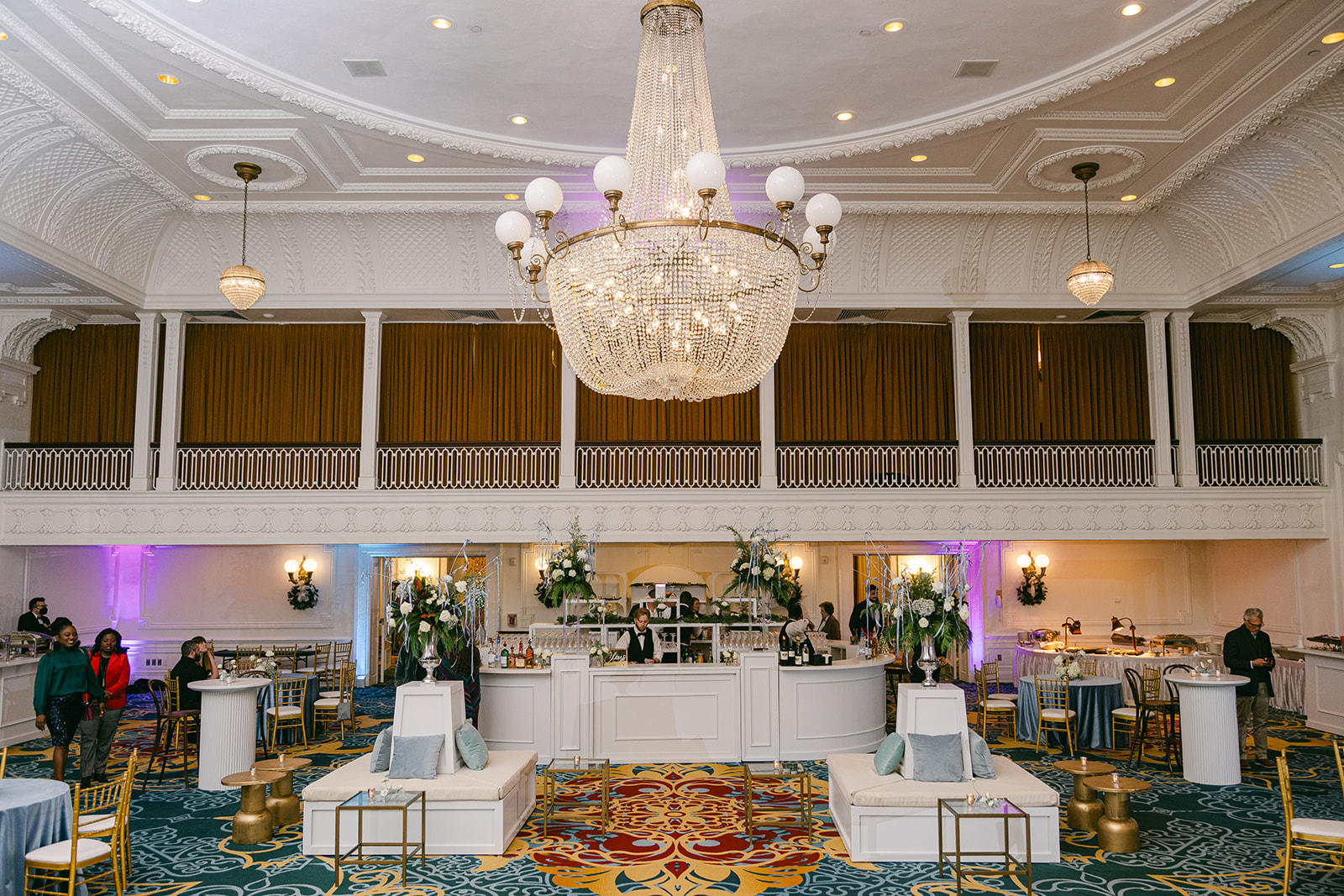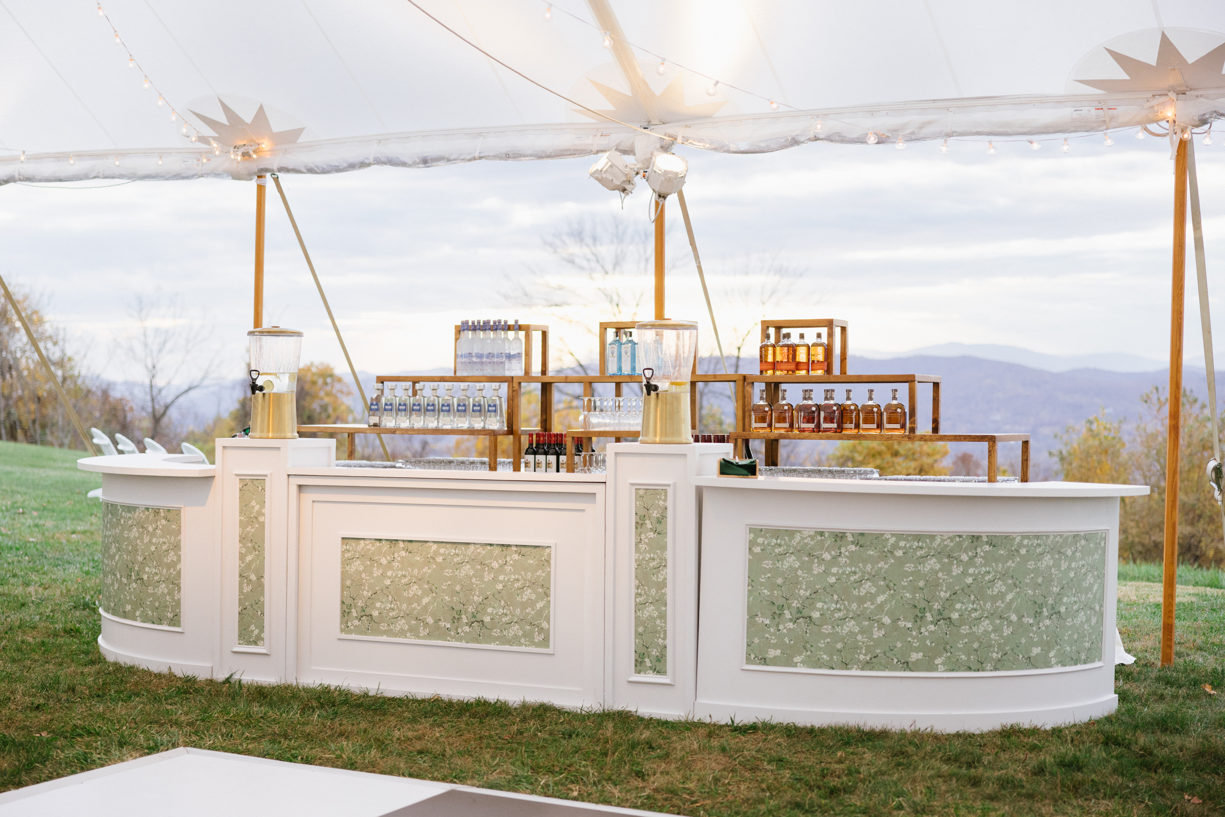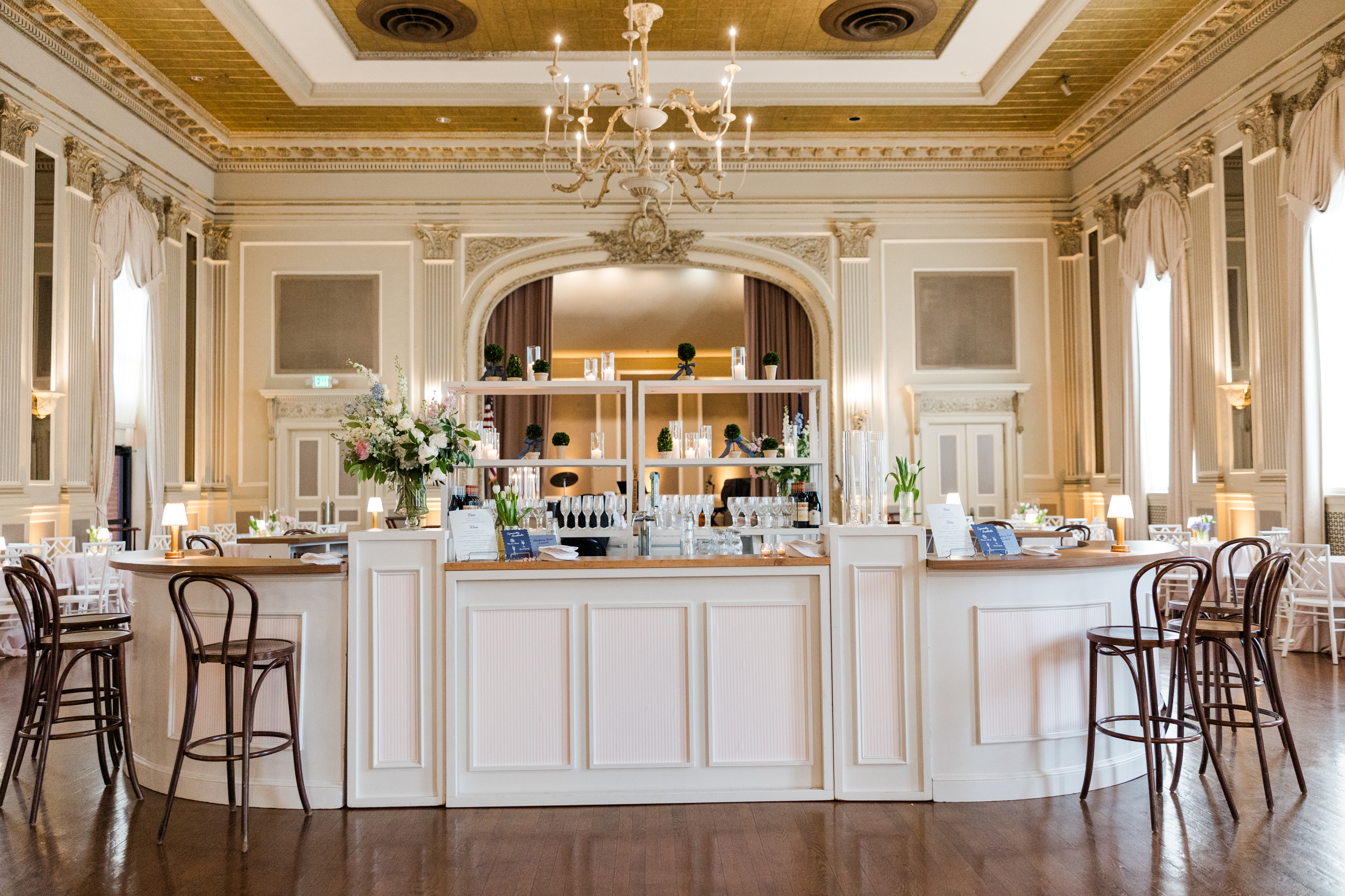 Stately white oval bar with crown molding detail and a white bar top. This large unique shape is a focal point for any event! Event images by Jen Fariello, Nicki Metcalf, and Brett Denfeld Photography.