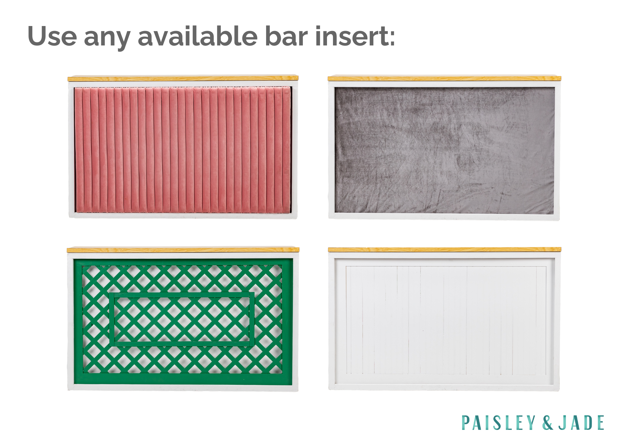 Our Shadowbox Bar has a new look! We added a new light wood bar top! The front of this bar is ready for you to style with florals, greenery, or fabric! This beauty is also available (by request) with our Copper Bar Truss, Wooden Top, or White Wooden Bar Top.