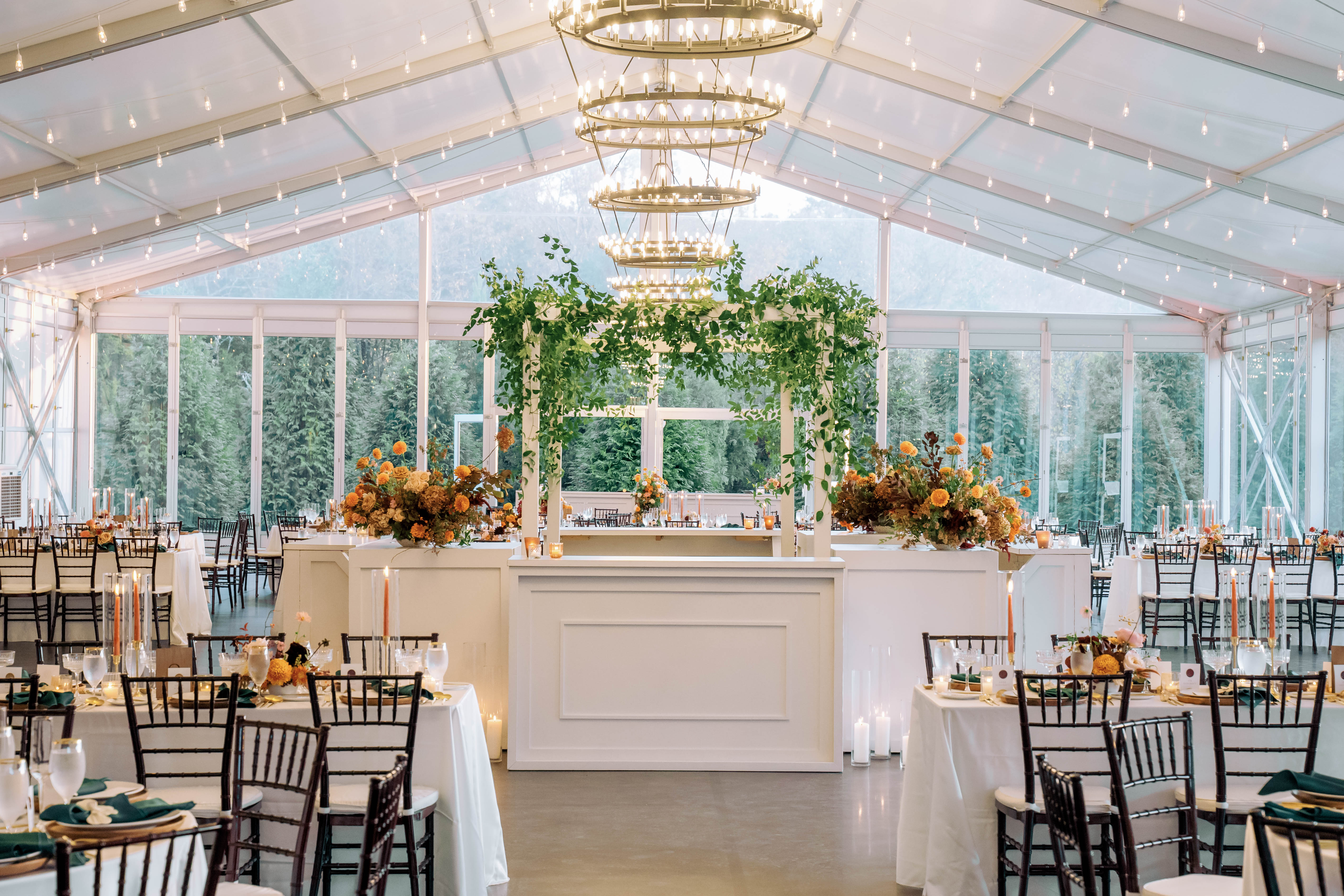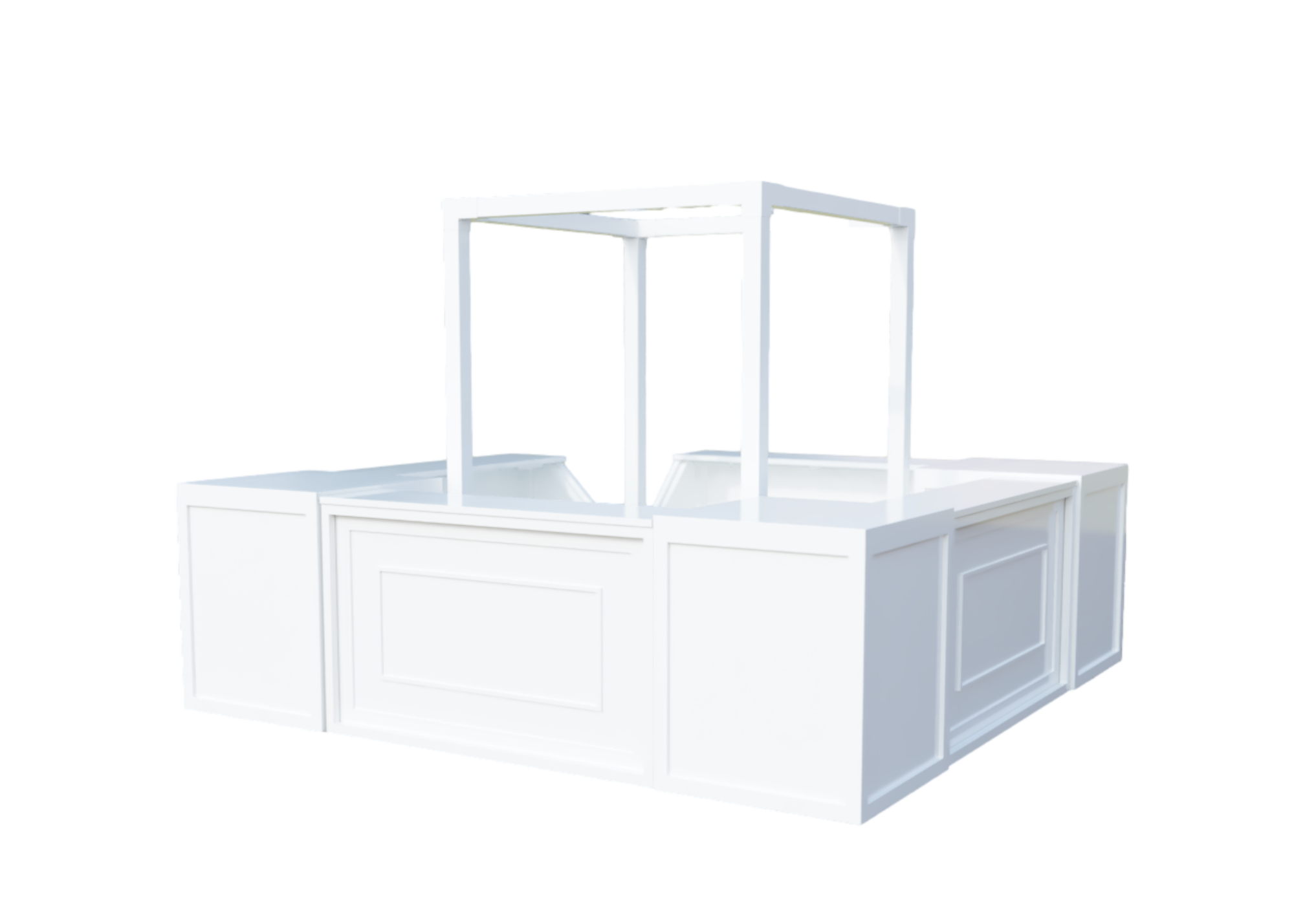 Stunning white square estate bar with a white truss. This square bar is made using our shadowbox bars, meaning the insert options are endless! See images of other shadowbox bar inserts we have in our inventory. Event image by Angela Elise.