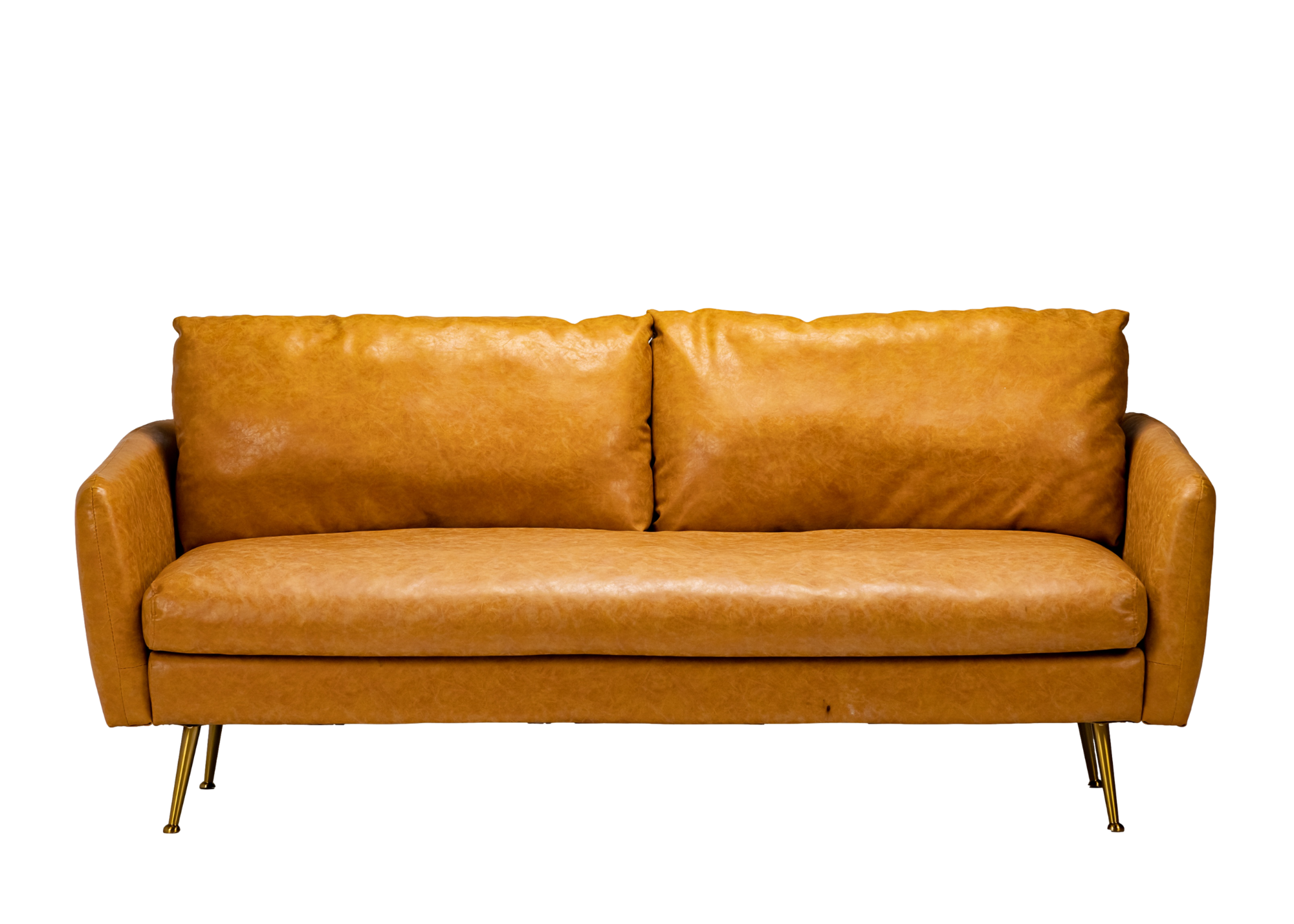 This handsome sofa has so much personality! Upholstered in a light brown vegan leather with gorgeous gold legs. This piece is a stunner in any lounge area, photo shoot or film production. Event images by