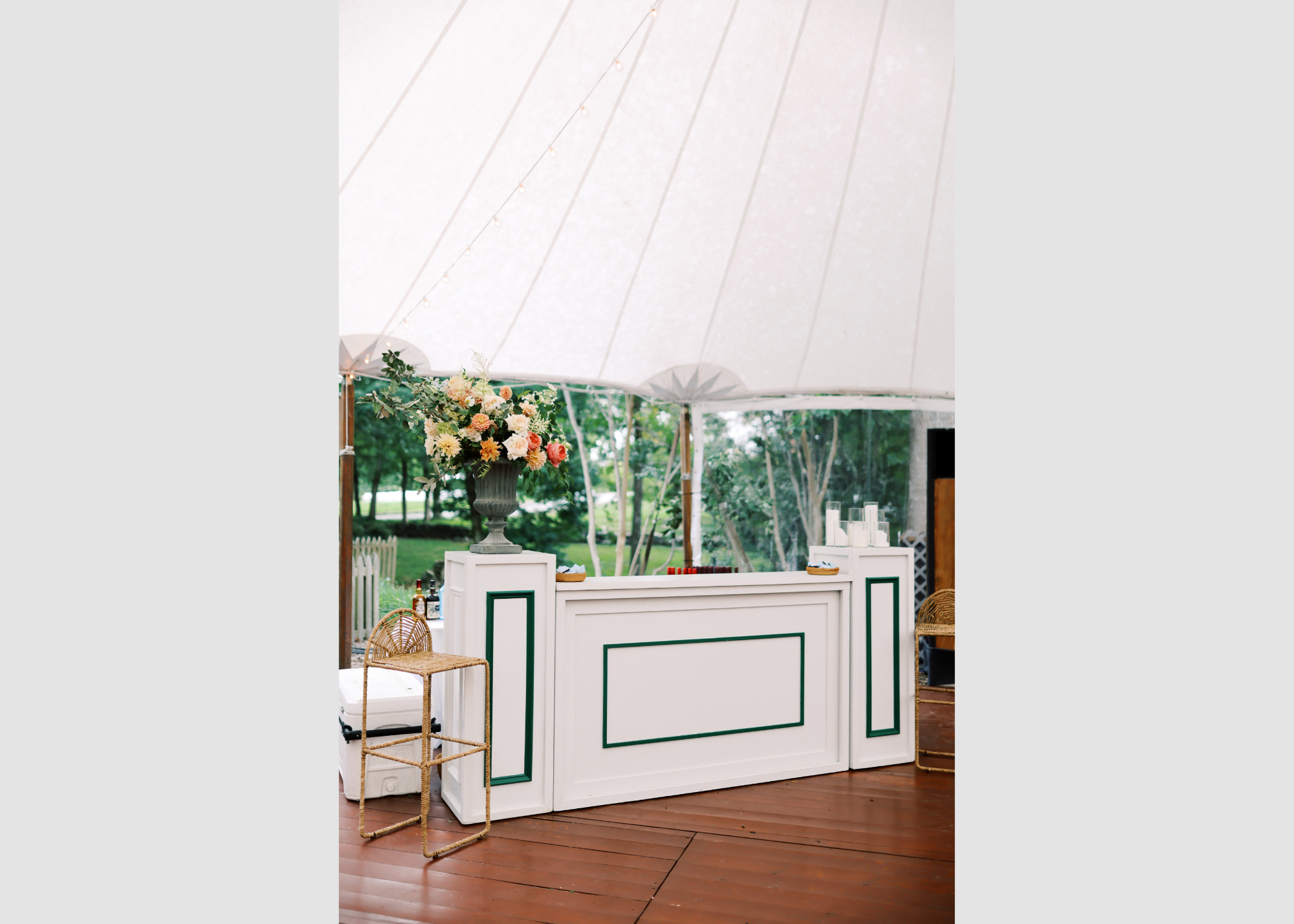 These white columns are part of the Estate line and create gorgeous end caps on our Shadowbox bars! Perfect for floral arrangements and to create dimension within your bar design! Event image by