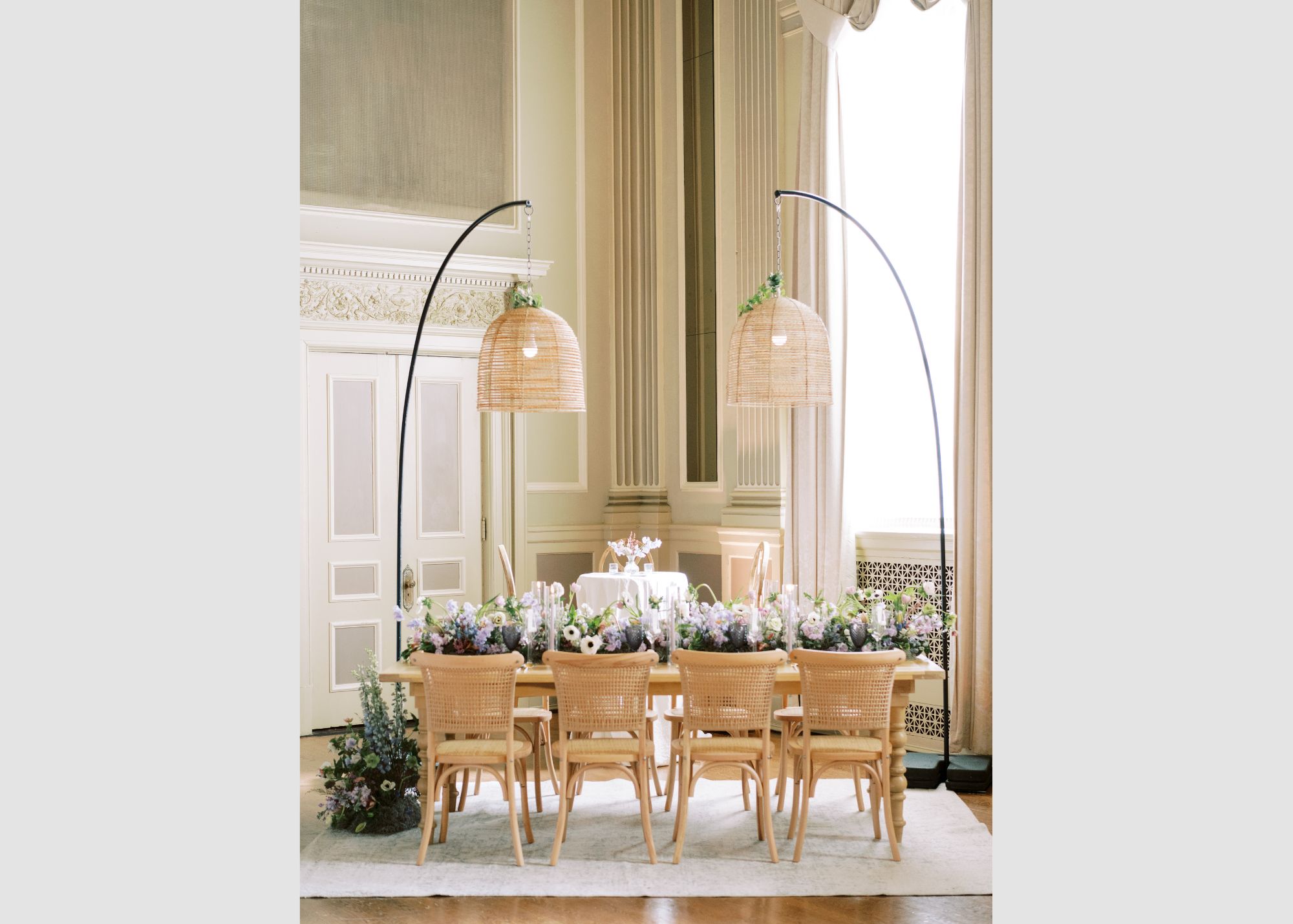 Description: This Freestanding Pendant Stand is a custom build that beautifully showcases our Medium Rattan Chandelier! Perfect for lighting over your bar, wedding aisle, or dinner tables! Event images by Natalie Jayne Photography, Alex C Tenser, and Danielle J Norton.
