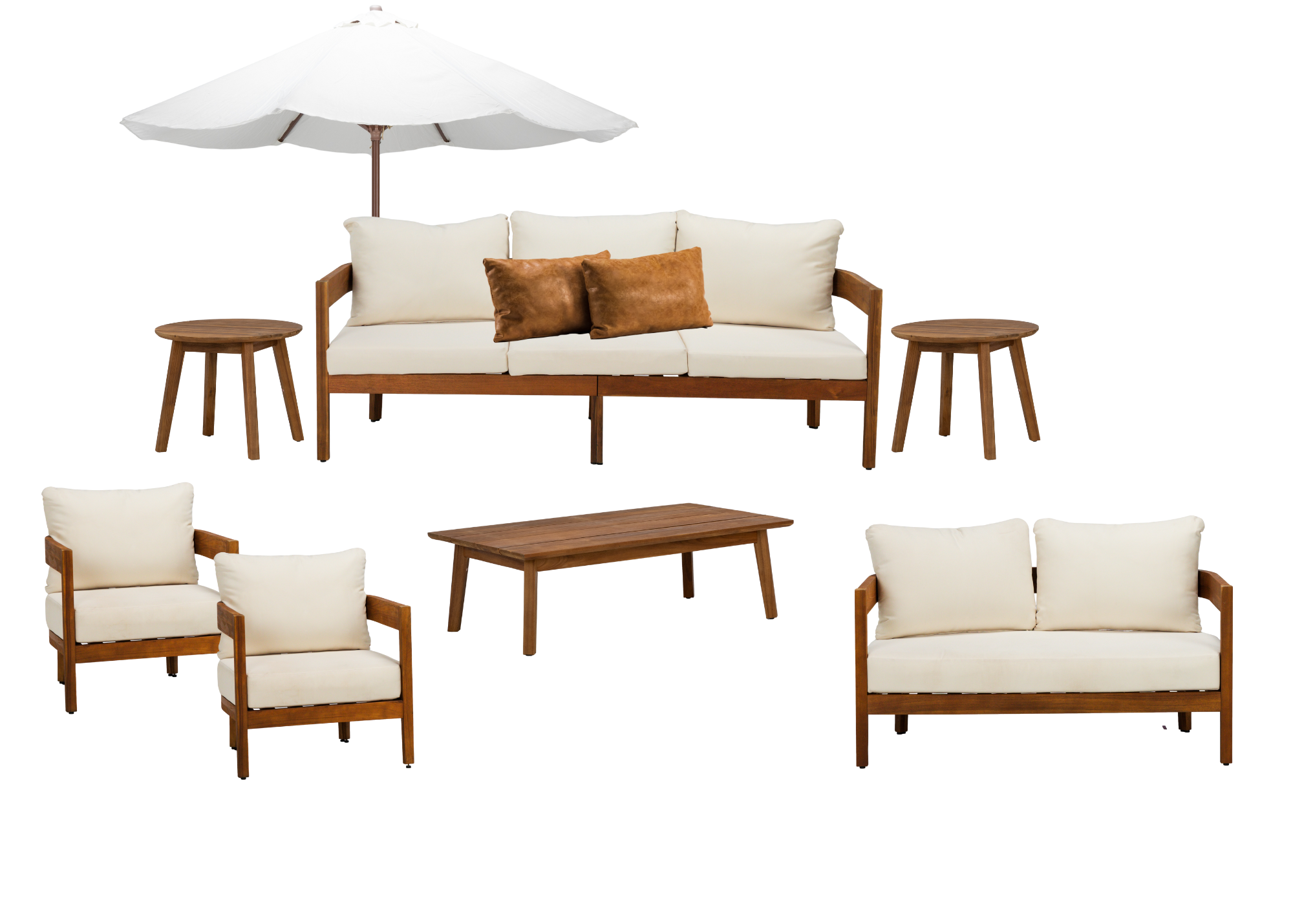 Our Leigh Lounge features beautiful outdoor furniture with wooden frames and water resistant neutral cushions. The perfect outdoor lounge set up for your guests to relax and enjoy!