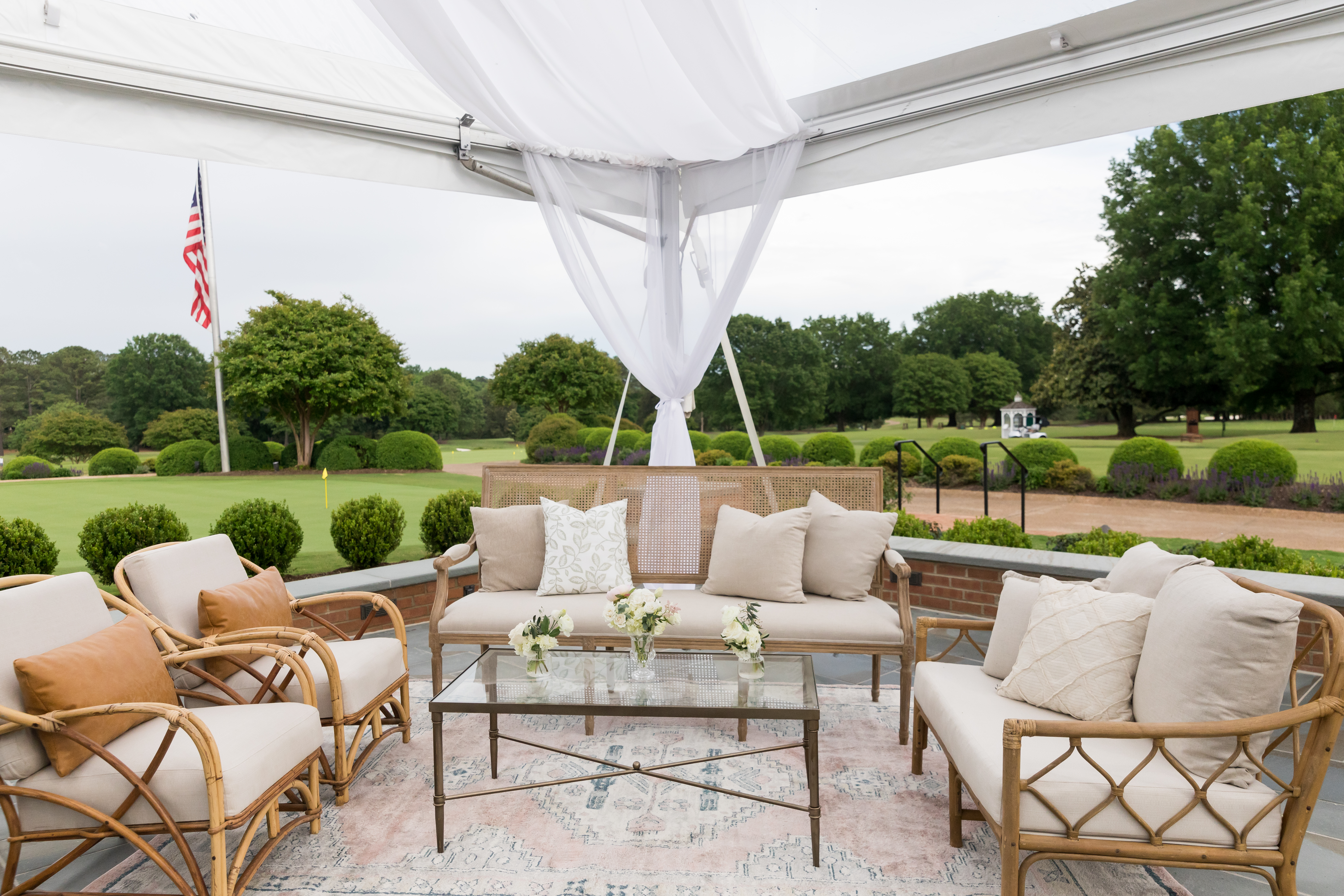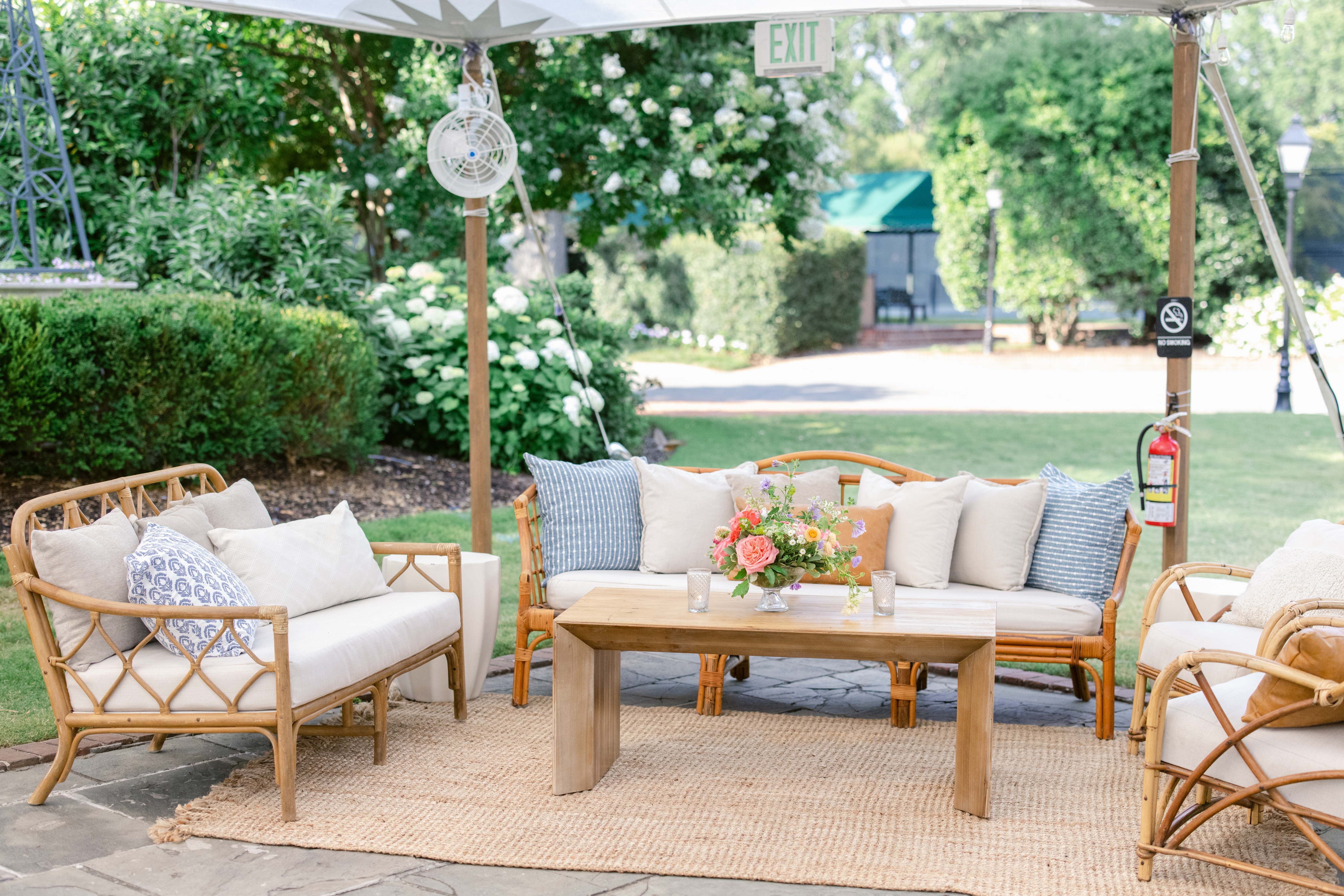This settee is sized just right - with detailing and neutral upholstery perfect for your next boho chic-inspired event! Event images by