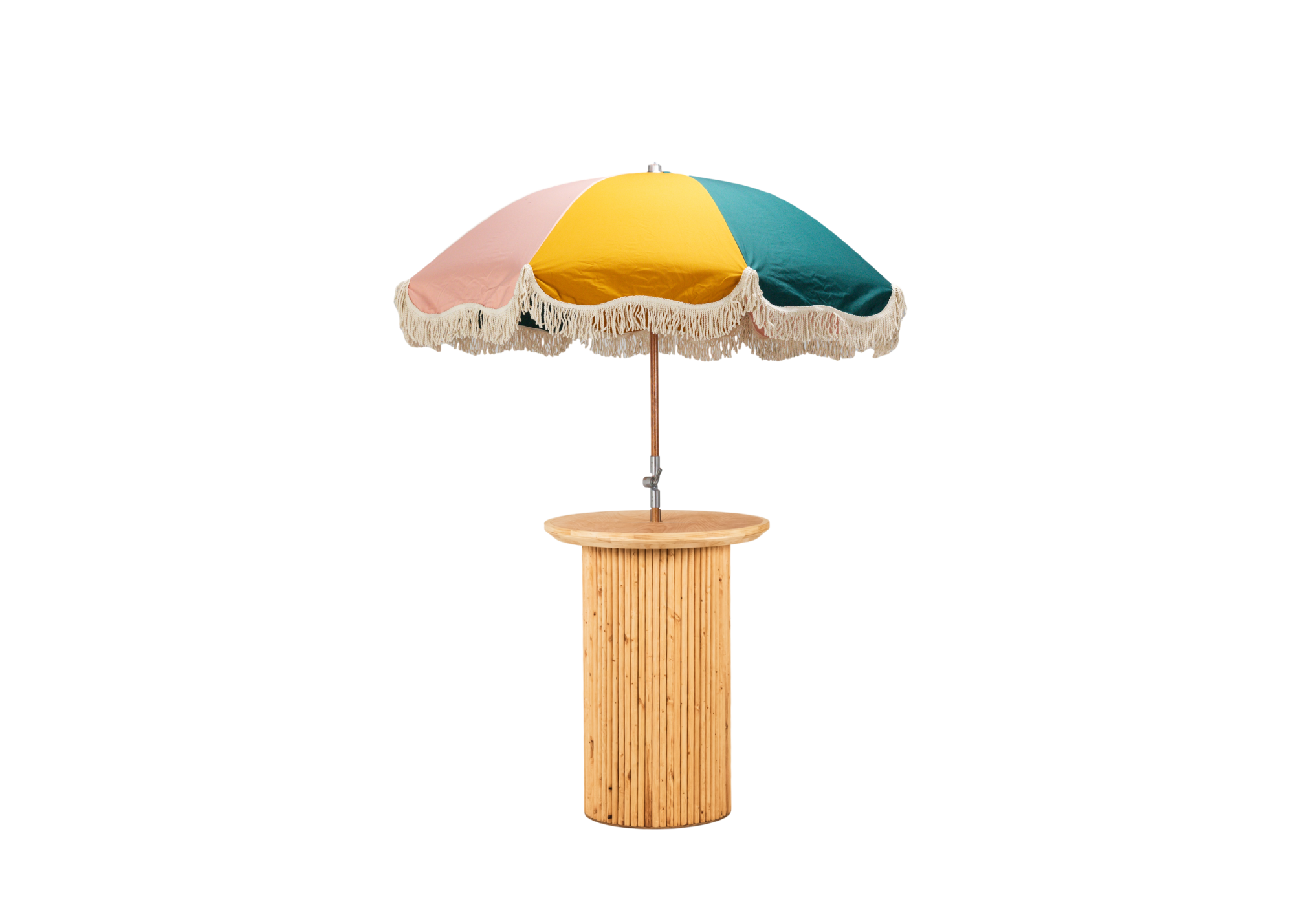 Light Wood Wilhelm Cocktail Table with Colorful Fringe Umbrella