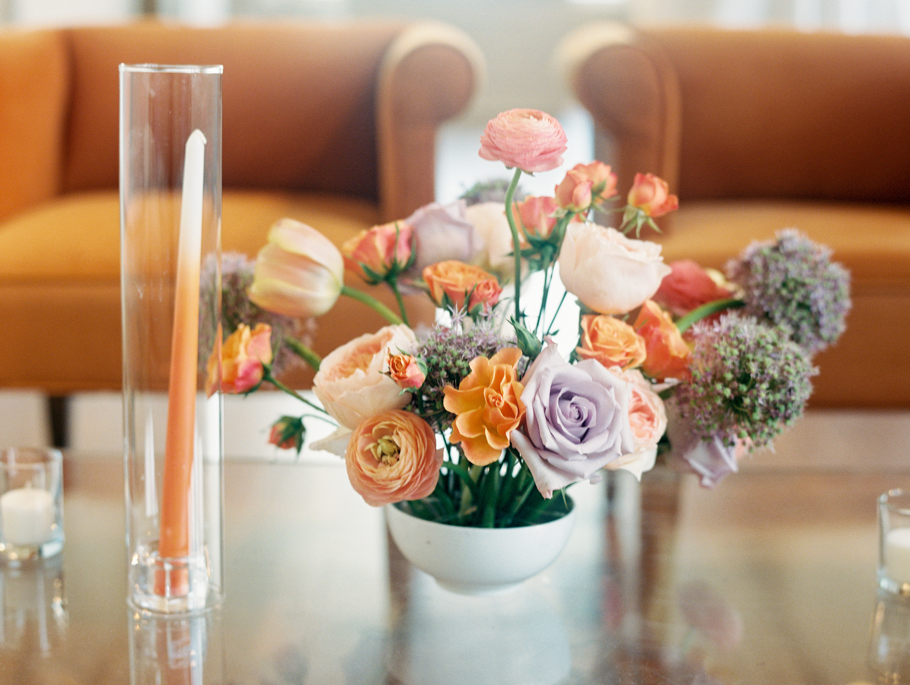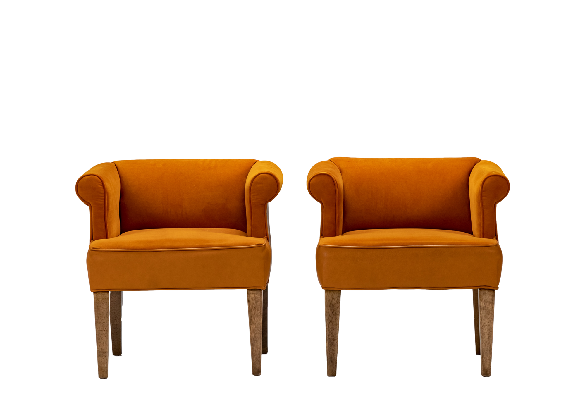 mid-century modern, orange, leather, light wood