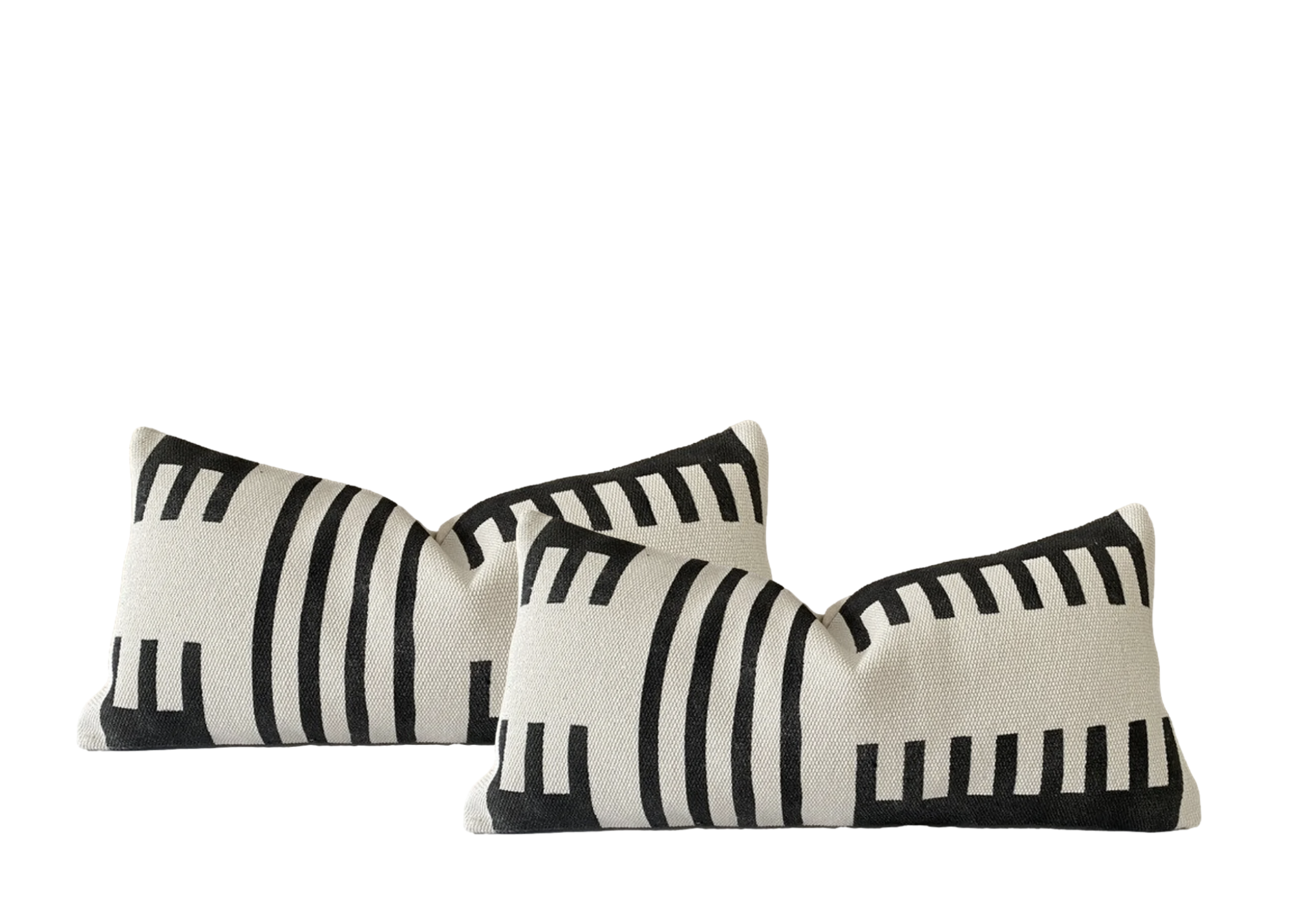 Add a bold yet sophisticated touch to your space with this pair of black and white striped lumbar pillows. Featuring sharp, clean lines in a classic black and white pattern, these pillows create a striking contrast that complements both modern and traditional styles.