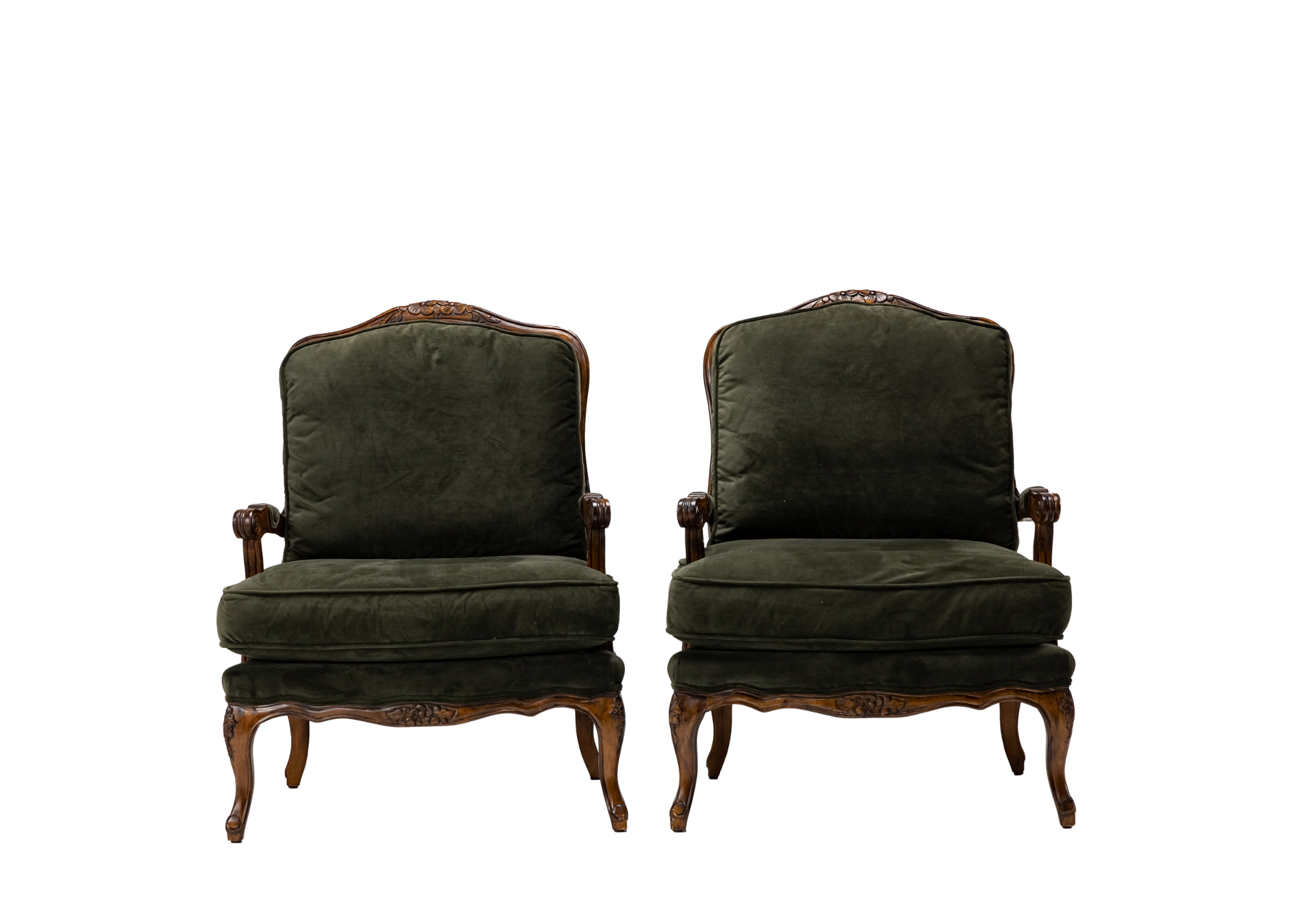 These stunners are not lacking in personality with their wooden legs complete with a floral detail, green velvet seating, and a caned back.
