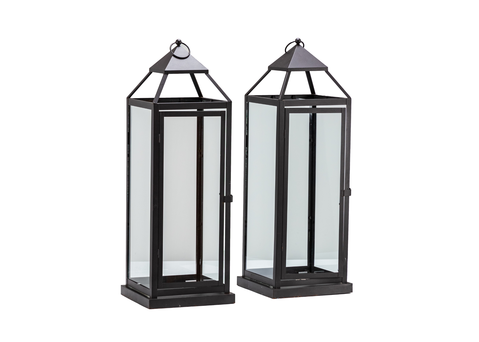 Metal lanterns in black. Great outdoor lighting option, decor piece, or floral vessels.