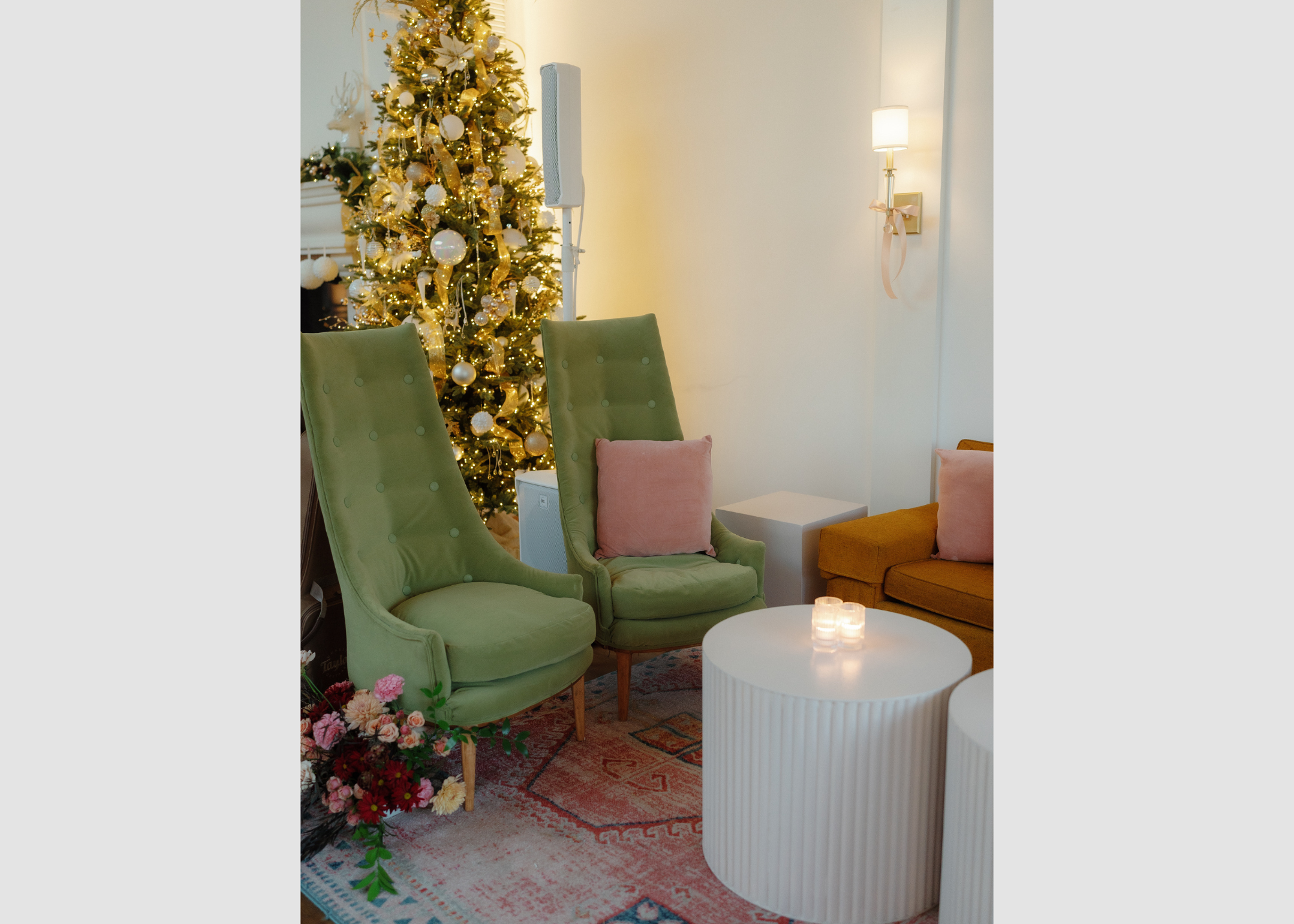 This pair of modern mid-century beauties are unique and whimsical! Upholstered in a vibrant green velvet, these chairs boast a great shape and are a fun and funky addition to any photo shoot or lounge area! Event images by