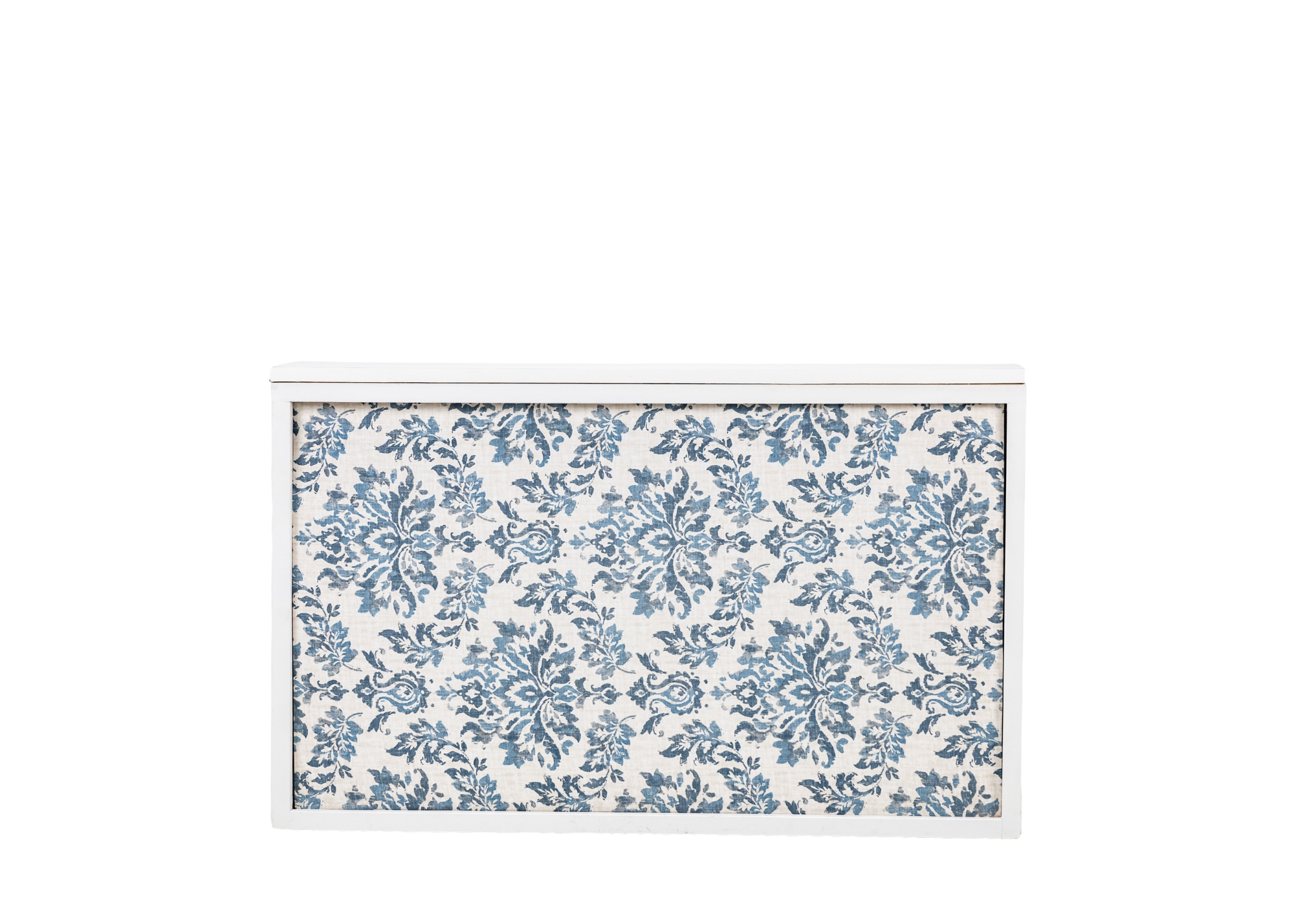 Our most customizable piece yet! Our Shadowbox Bar is as functional as it is pretty! The front of this bar features a blue & white fabric insert sure to make a statement at your next event!