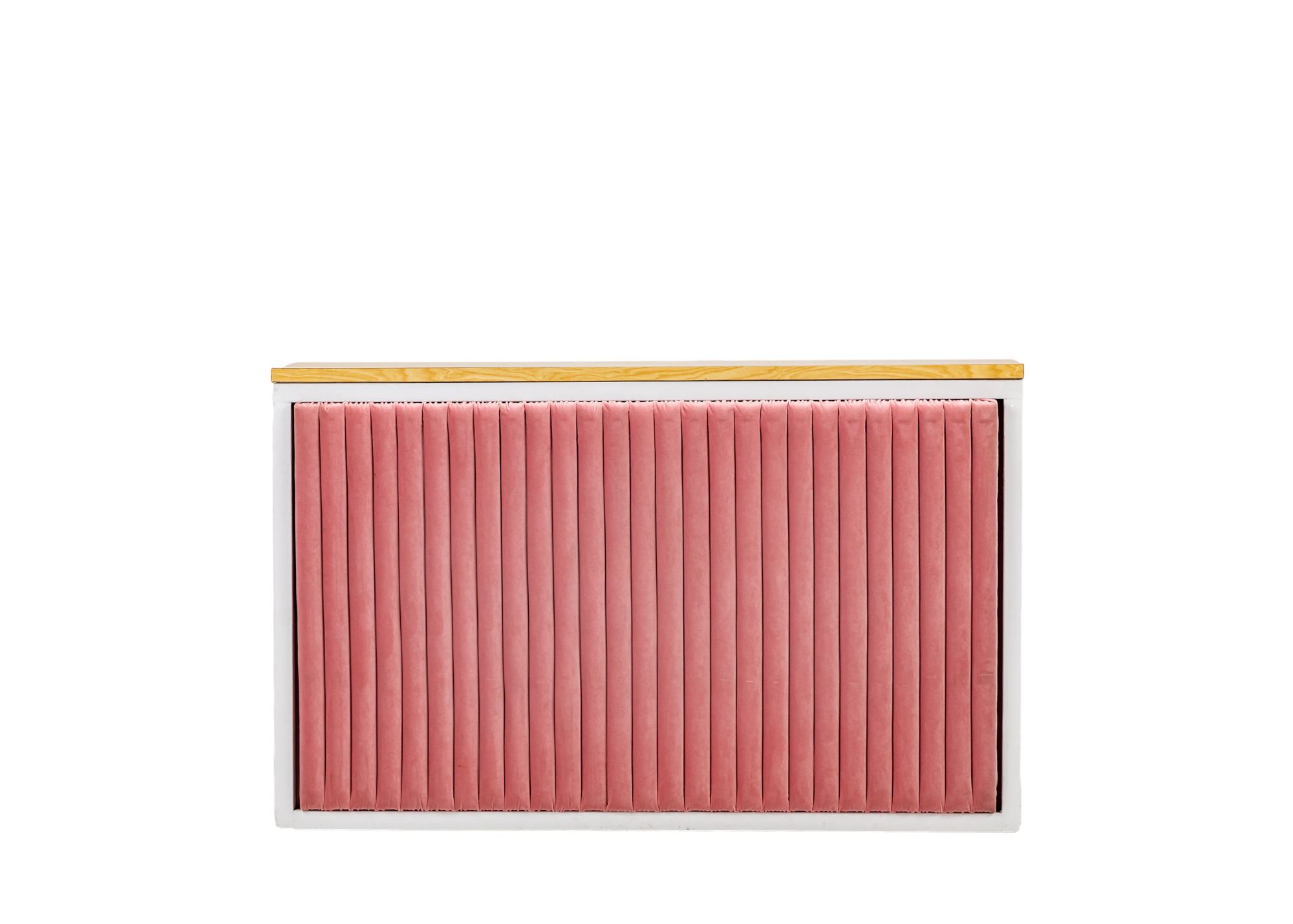 Our Shadowbox bar is as functional as it is pretty! This stunning upholstered bar front highlights the soft pink velvet and luscious curves of our unique Malibu sectional!