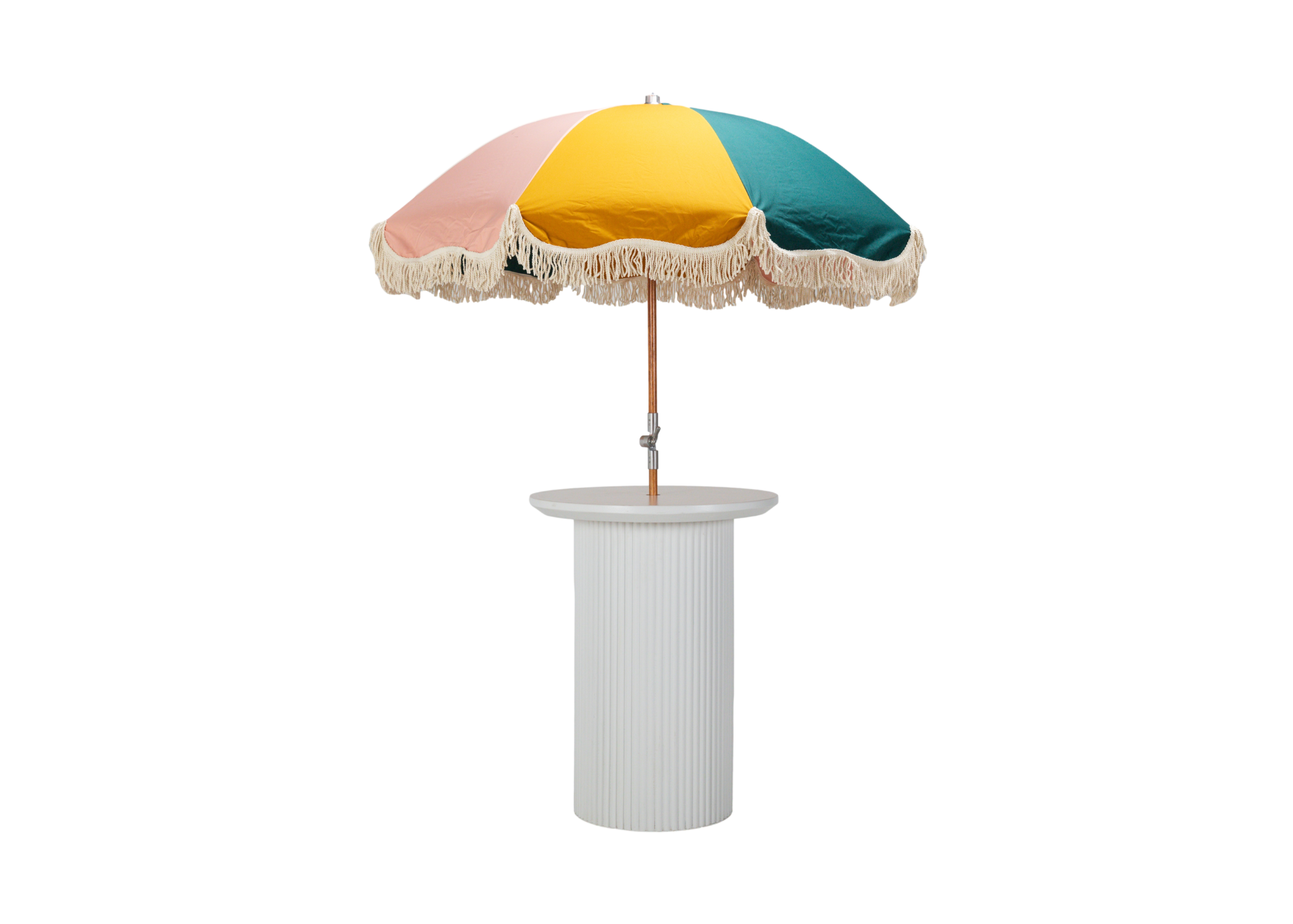 White Wilhelm Cocktail Table with Colorful Fringe Umbrella